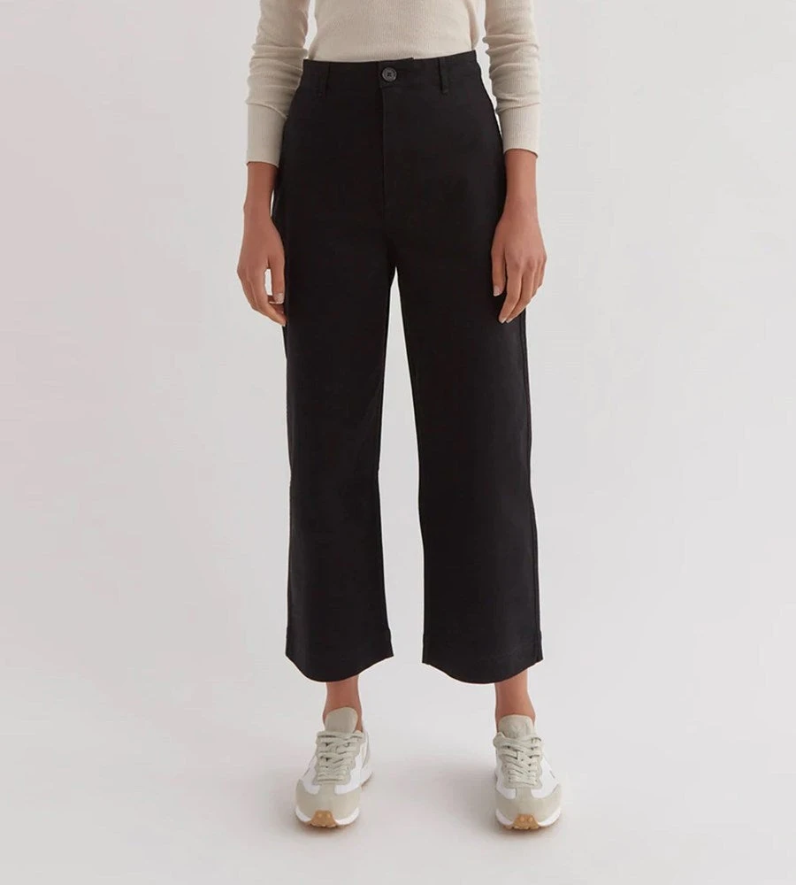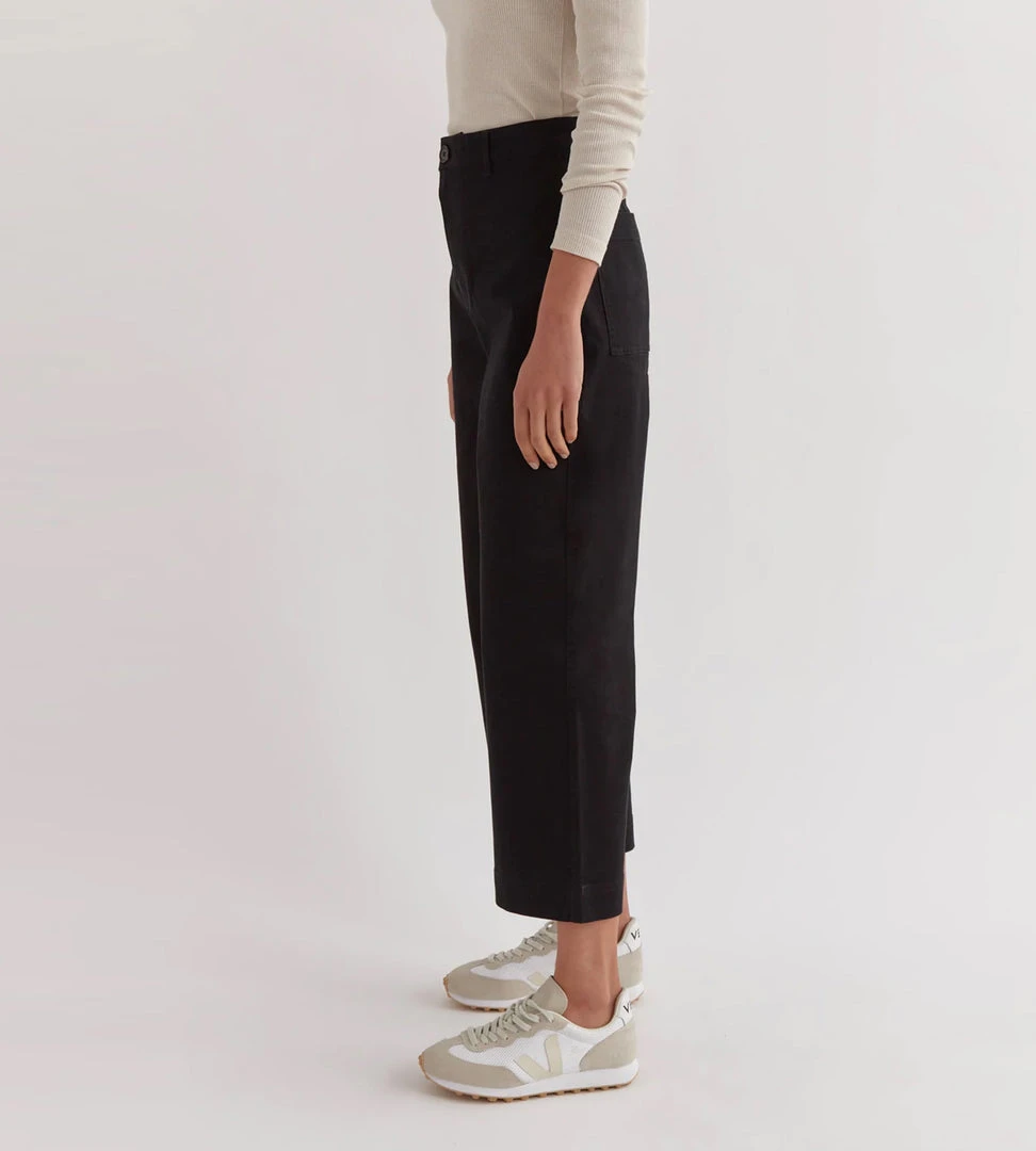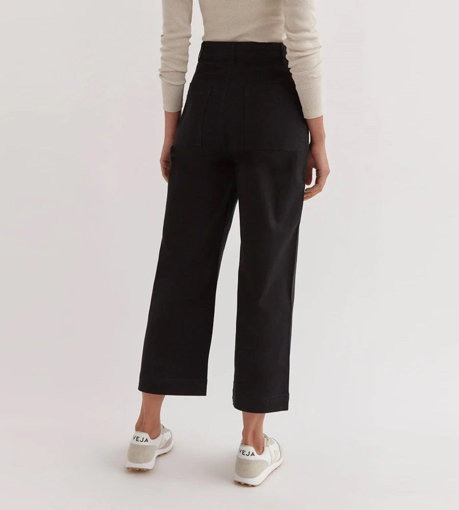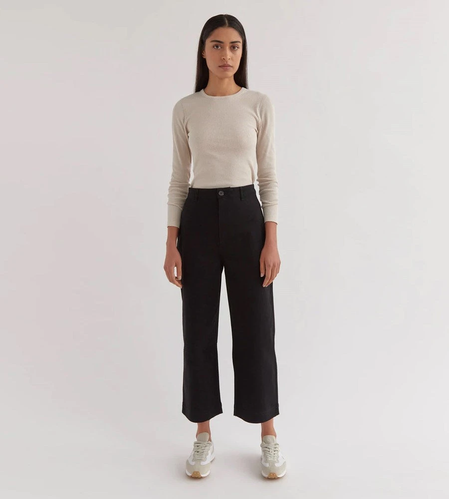 The Hana Twill Pant is a structured pant style designed with a high rise cut. This piece features a button and zip closure and is complete with utility-style back pocket detailing.