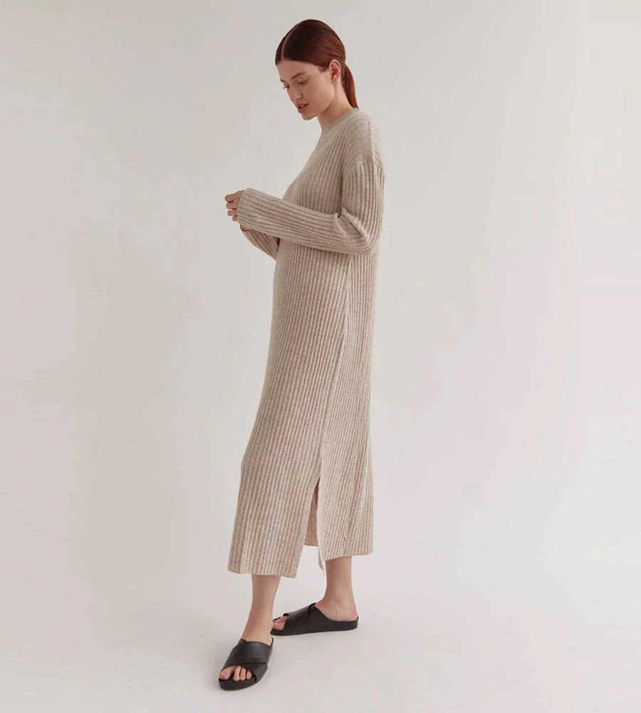 This Long Sleeve Knit Dress is a minimalist and relaxed design made from a wool cashmere blend. This dress features a subtle rib and a-line skirt, making for the perfect desk to dinner outfit. Made from 90% Wool, and 10% Cashmere and features a relaxed and comfortable fit.