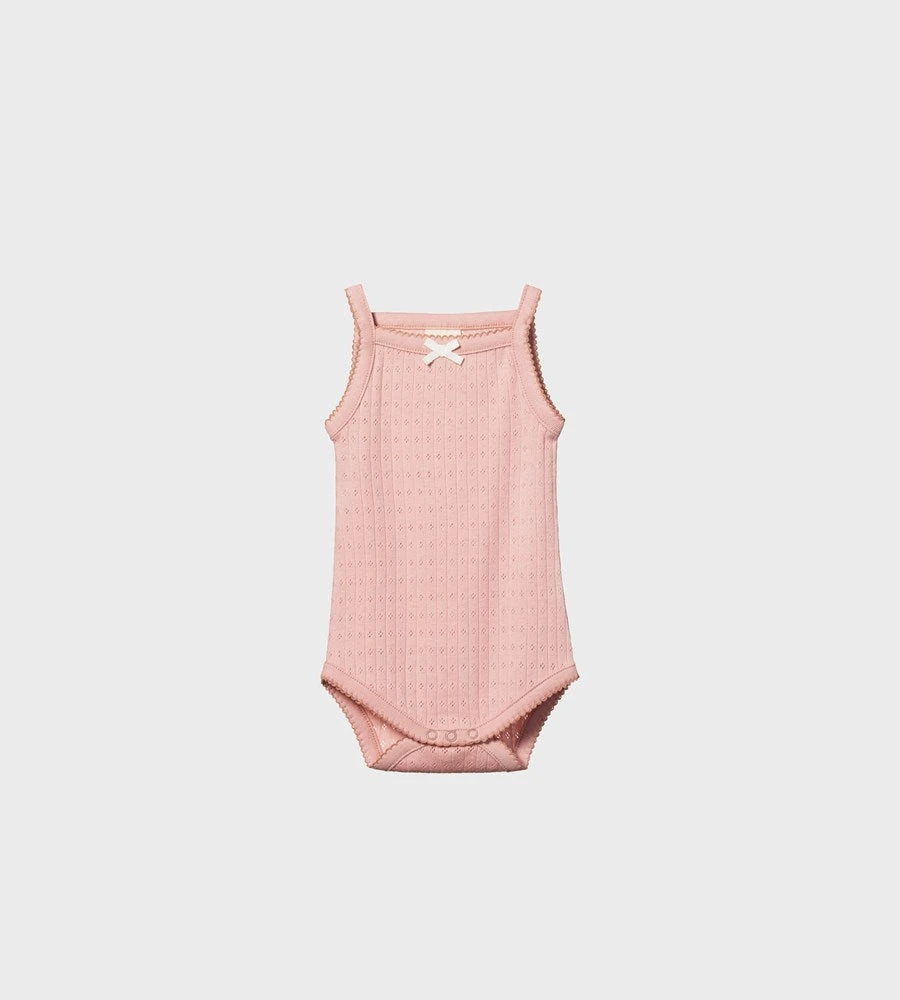 A sweet singlet bodysuit designed for girls. Made in Nature Baby’s beautiful pointelle fabric that’s super soft and stretchy, has a thermal quality and delicate open weave. Cute to wear on its own, team with shorts for a summer outfit, or wear as an extra layer close to the skin in cooler weather. Made from soft organic cotton.