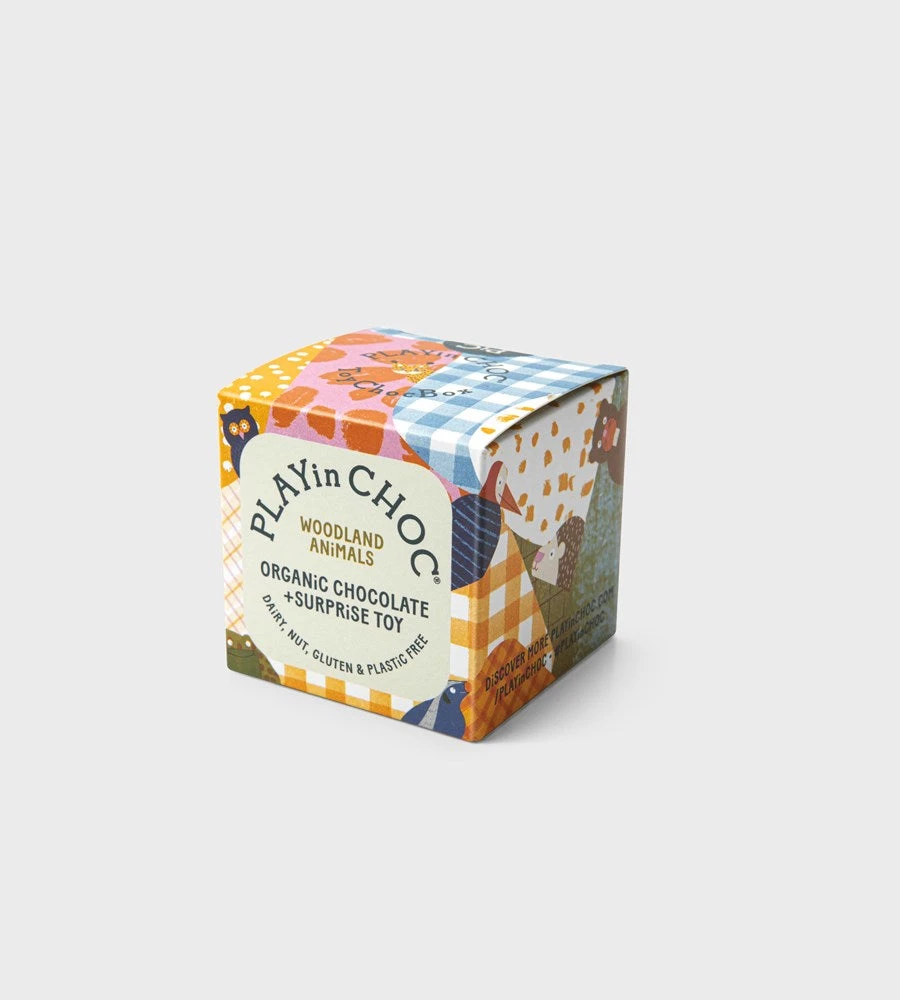 Each PLAYin Choc toy box contains two individually wrapped, deliciously creamy, organic, dairy-free chocolates, a 3D cardboard puzzle toy to assemble and a fun facts card.