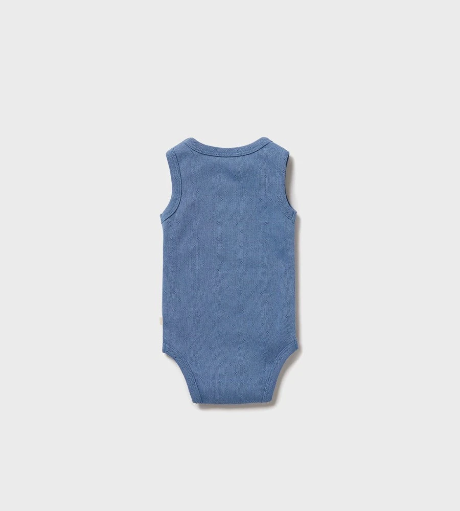 Made from 100% GOTS certified organic cotton, Wilson & Frenchy’s pointelle singlet bodysuit features a snap crotch opening for quick nappy changes.