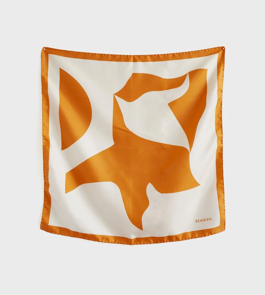 Bembien’s Eloise Scarf features organic, modern shapes in a beautiful apricot orange. This silk scarf is the perfect piece to tie together your summer looks and will add life to your summery colour palette. Wear this scarf in your hair, around your neck, on your Bembien bag, or show off your tan lines and wear it as a summery top.