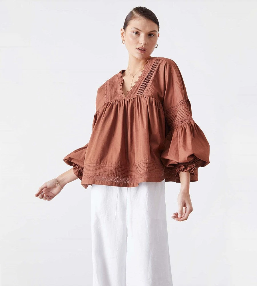 The Marlo Organic Cotton Smock Top by Joslin is a beautiful oversized smock style top with trapeze flare that has been crafted from certified organic cotton poplin. Featuring details like and a contrast cotton voile sleeve hem with elasticised cuff and partial lining through the body for comfortable wearing.