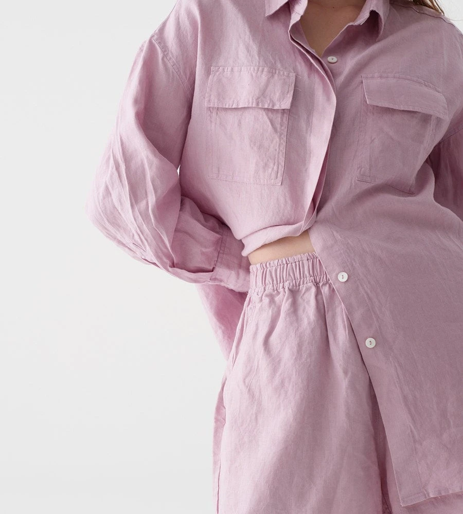 A modern classic shirt inspired by mens tailoring and cut for a loose-fit. The matching shorts have an effortless silhoutte with a subtle flare. Perfect for sleepwear and daywear.
