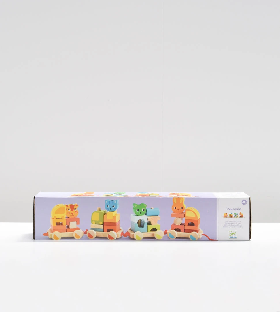 Get creative with this fun and colourful set of blocks that can be rearranged and assembled. The set comes with 4 wheeled bases that connect to one another. Each base has two wooden pegs to stack wooden blocks onto to build the passengers. The set comes with 35 blocks and each has a hole to put on the pegs of the cars. All pieces are wood except the car connectors and the pull string. Use it as a train to be pulled along or build up the blocks to create all different shapes.