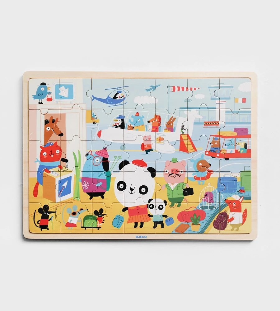 Puzzlo Airport is a wooden puzzle. On a wooden base, children piece the puzzle together to discover very busy animals in an airport. Ready for take-off?