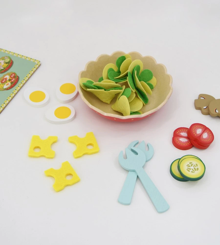 A colourful little wooden food set for little chefs to make the perfect caesar salad.