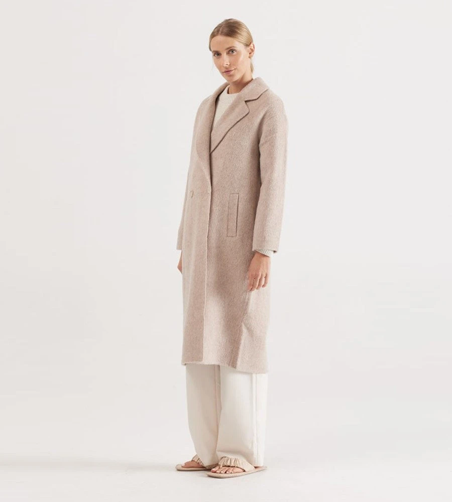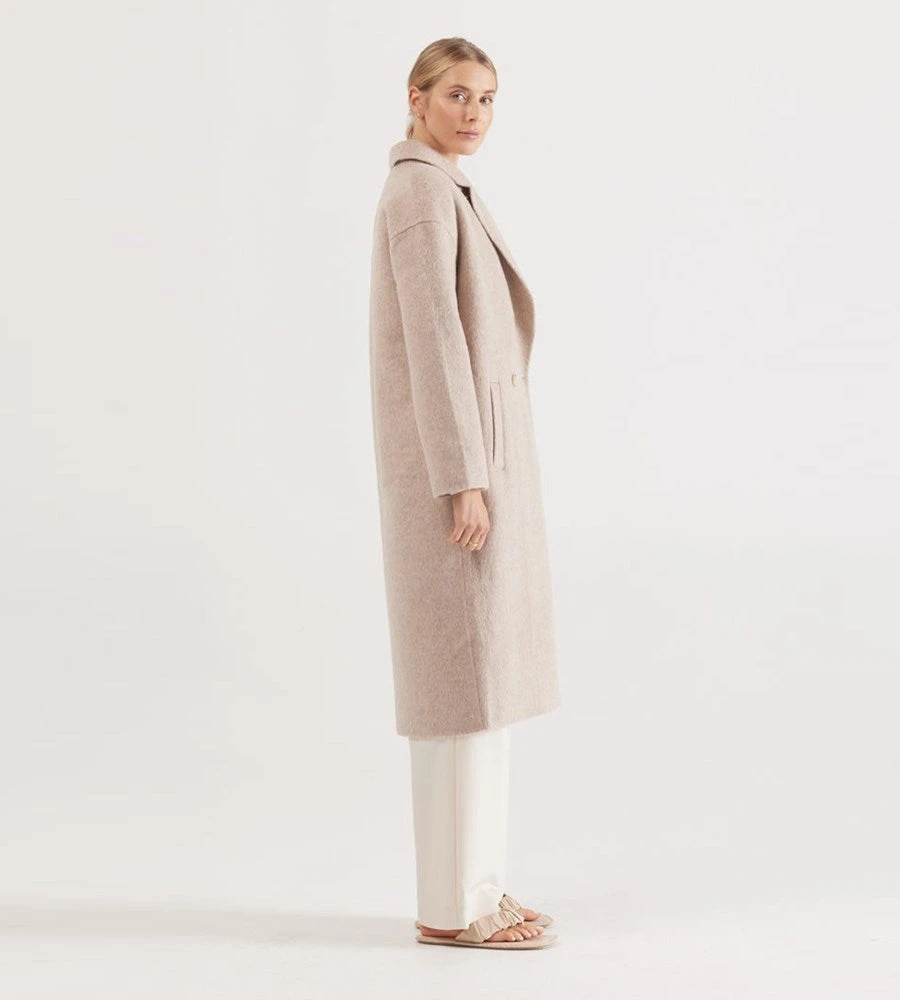 Switch up the dark shades for oatmarle hues this Autumn with Elka Collective’s Sonnet Coat. Finished by hand, this classic style is constructed in double faced wool, unlined for soft structure and features a modern profile that layers just as well over denim as it does with tailored pieces. Features a cocoon shaped body, dropped shoulders and front pockets.