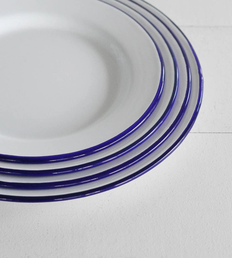 These traditional enamel plates with blue rims are perfect for dinner parties or for taking away on camping trips and picnics.