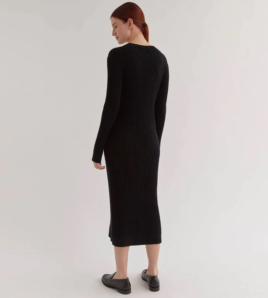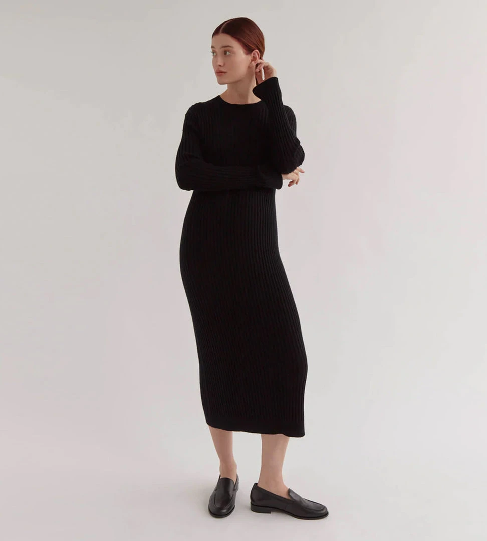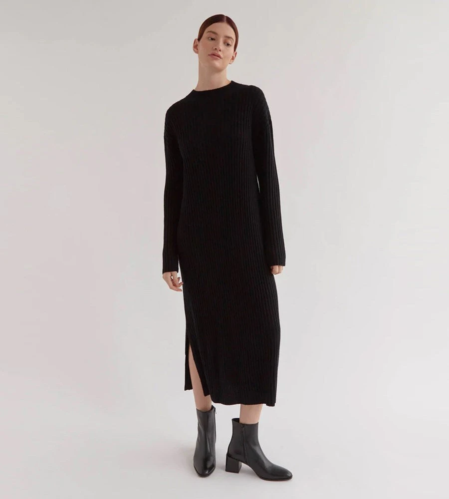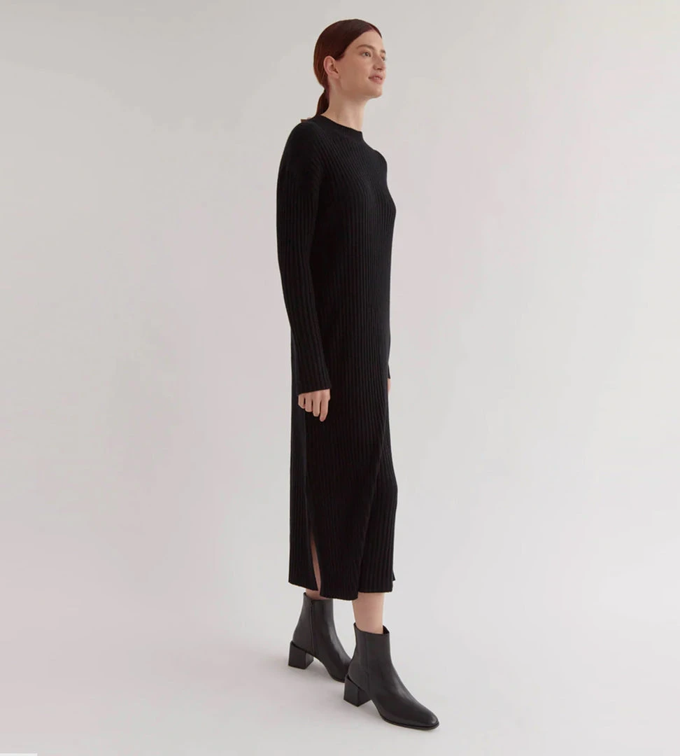 This Long Sleeve Knit Dress is a minimalist and relaxed design made from a wool cashmere blend. This dress features a subtle rib and a-line skirt, making for the perfect desk to dinner outfit. Made from 90% Wool, and 10% Cashmere and features a relaxed and comfortable fit.