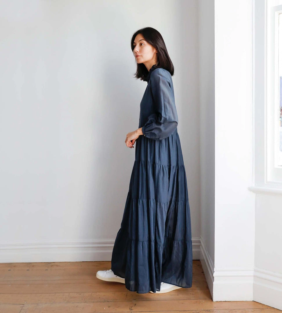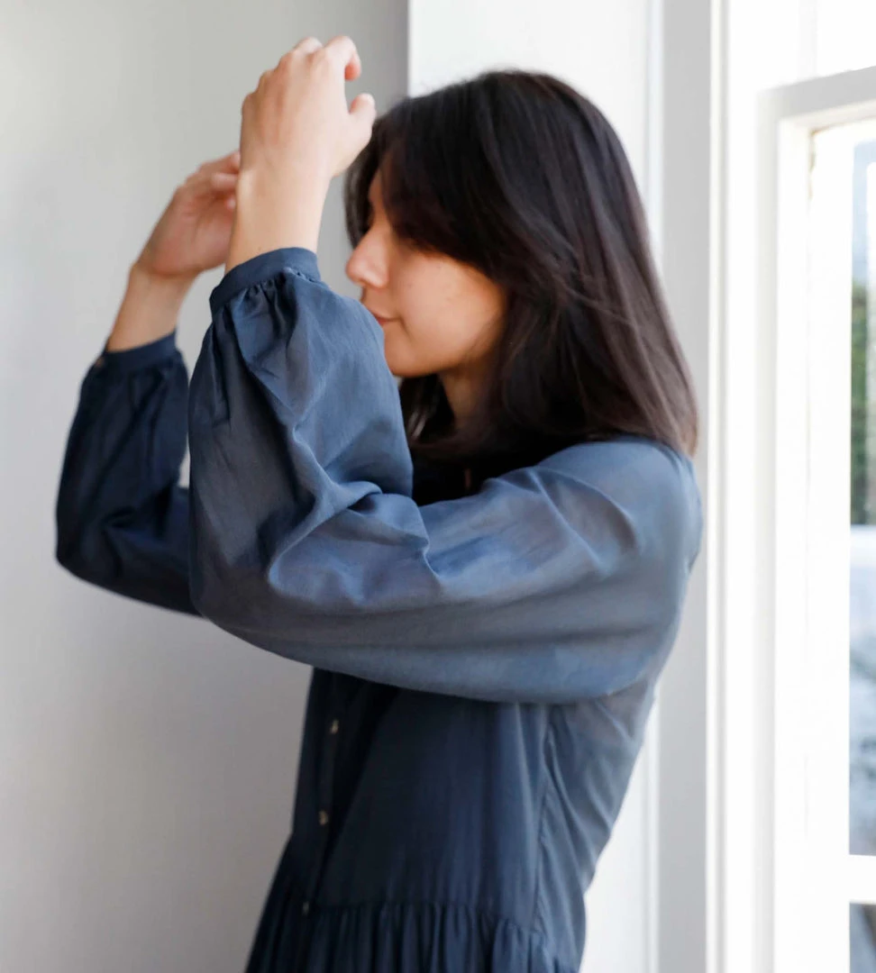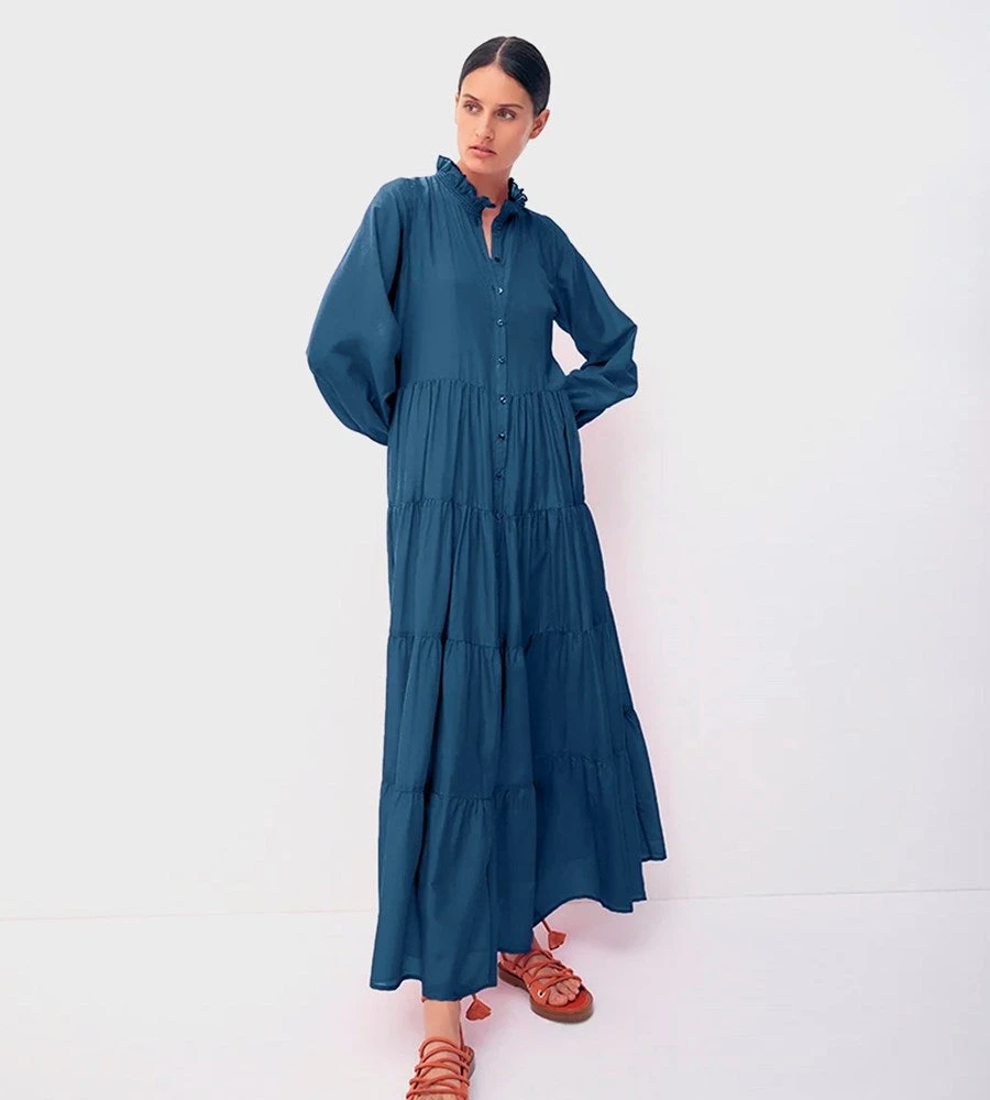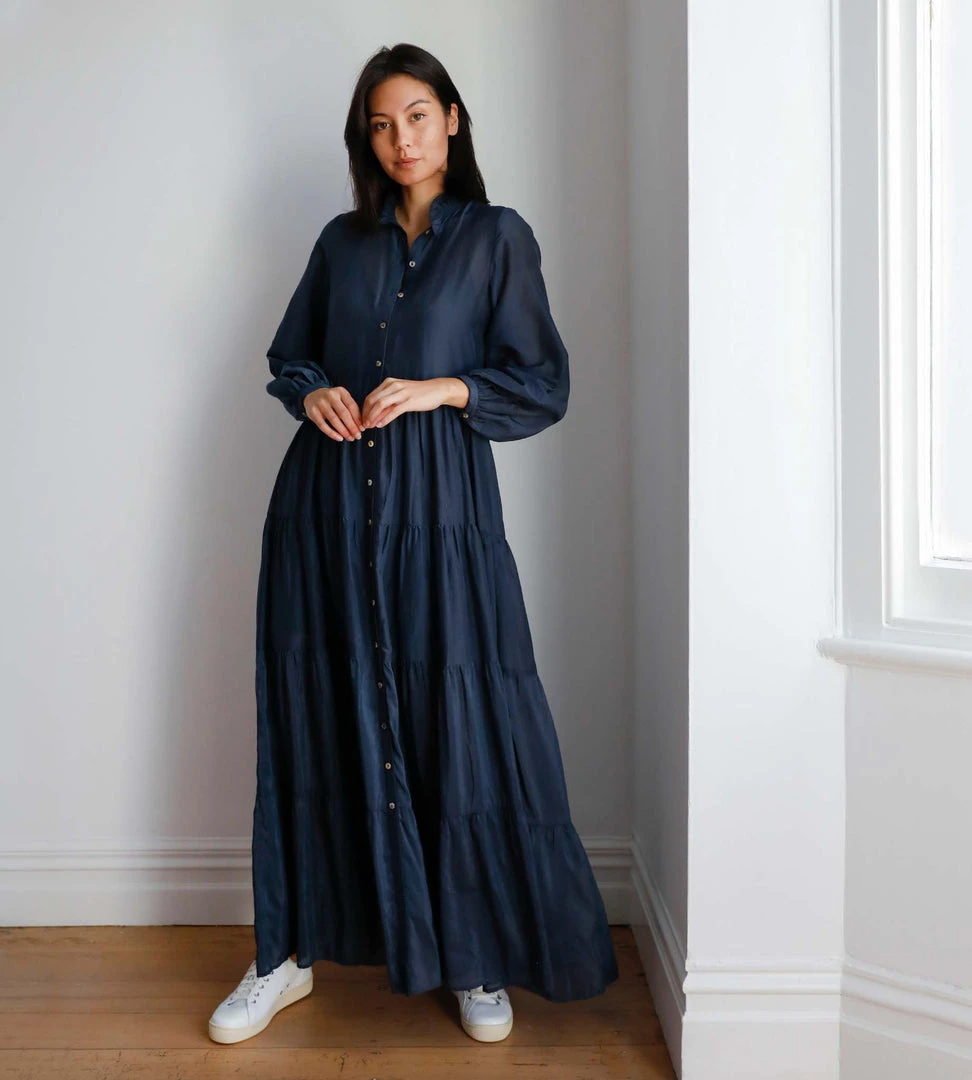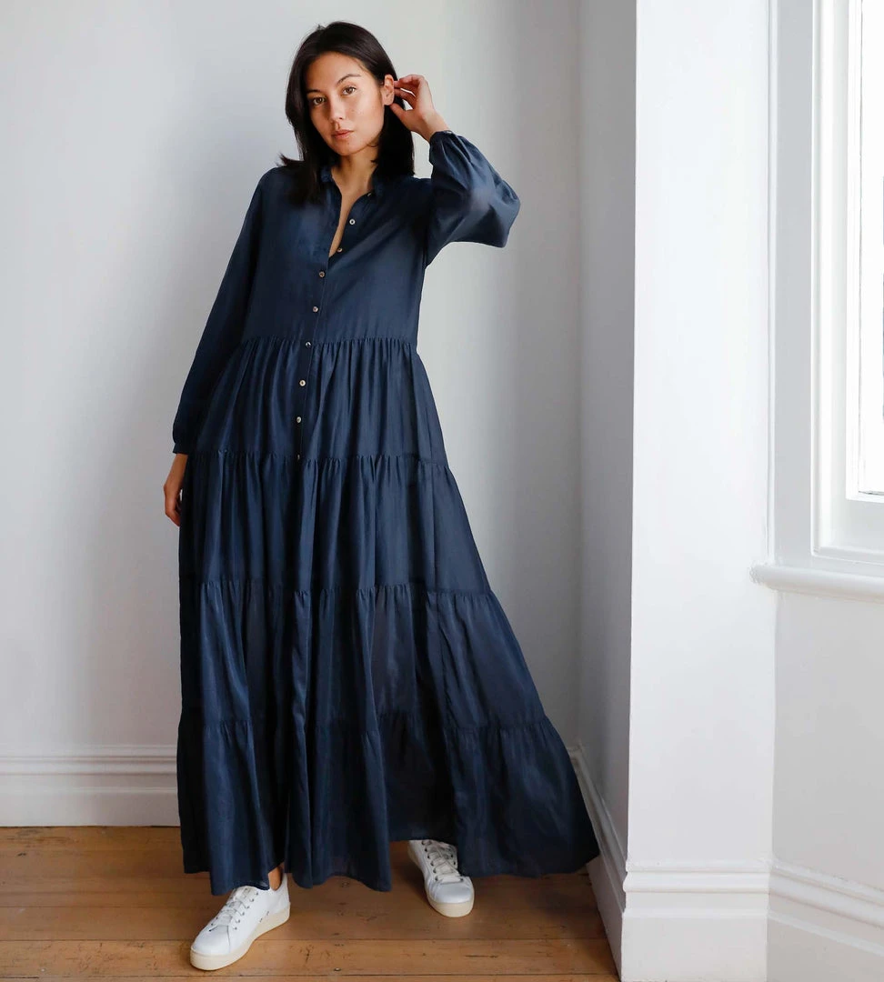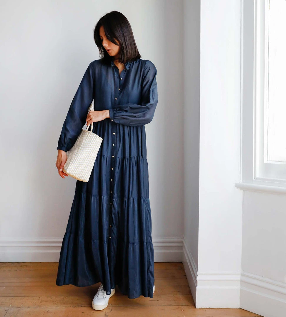 Inspired by summer romanticism and effortless sophistication, Bird and Knoll’s James Maxi Dress is a relaxed yet elegant option. The delightfully lightweight cotton silk fabric lends itself to the loose and flowing tiered silhouette of this wistful button up maxi. Shell buttons secure the cuff, while signature shirring and frill details frame the collar lending it an artistic quality. A matching lightweight cotton voile slip is included to avoid transparency. A summer vacation essential, wear open over a swimsuit poolside by day, then team with heels and statement jewellery for nights spent sipping cocktails and dining under the stars.