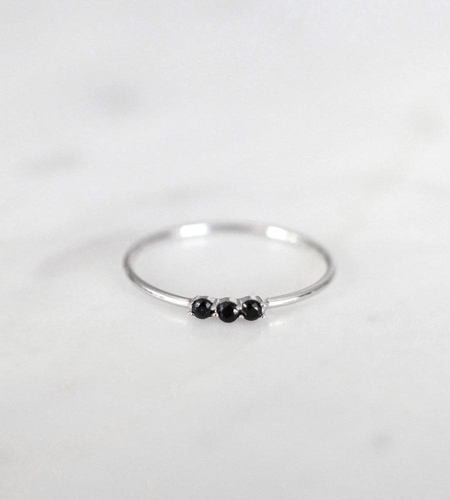 The daintiest ring featuring three tiny little black mini rocks. Perfect for stacking. Our heart sings!