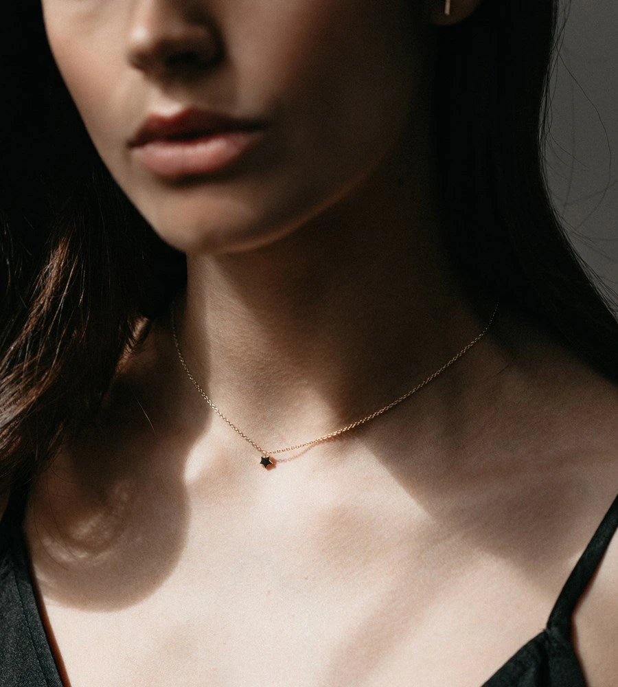 A fine chain with a little star pendant. A simple look on its own and just as nice layered with other pieces. Chain length 40 – 45cm (adjustable) and pendant size is about 5mm in height Available in sterling silver or 14kt gold plated.