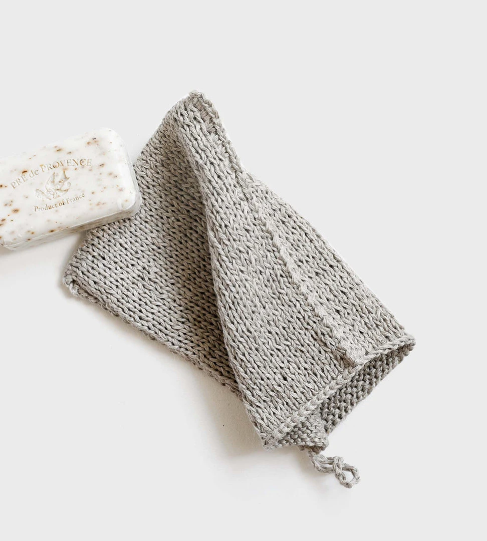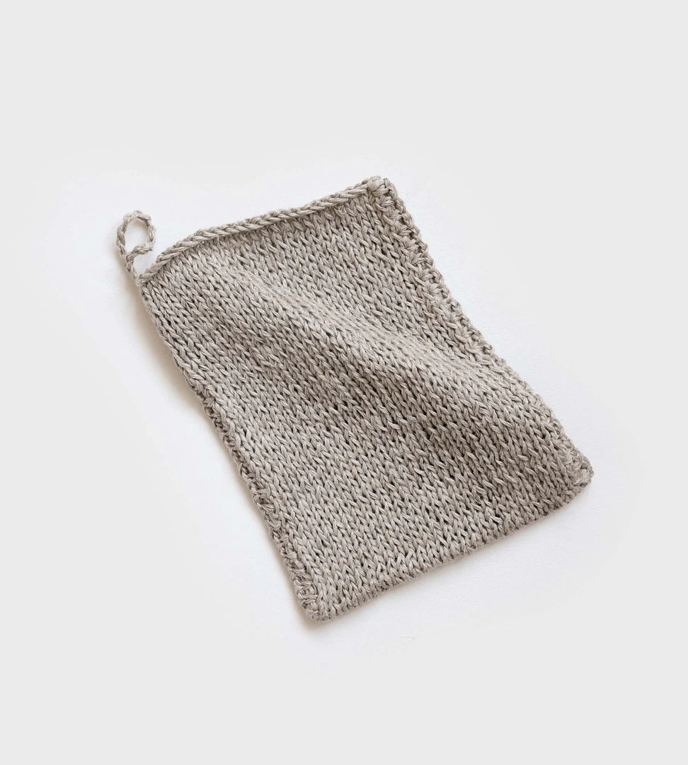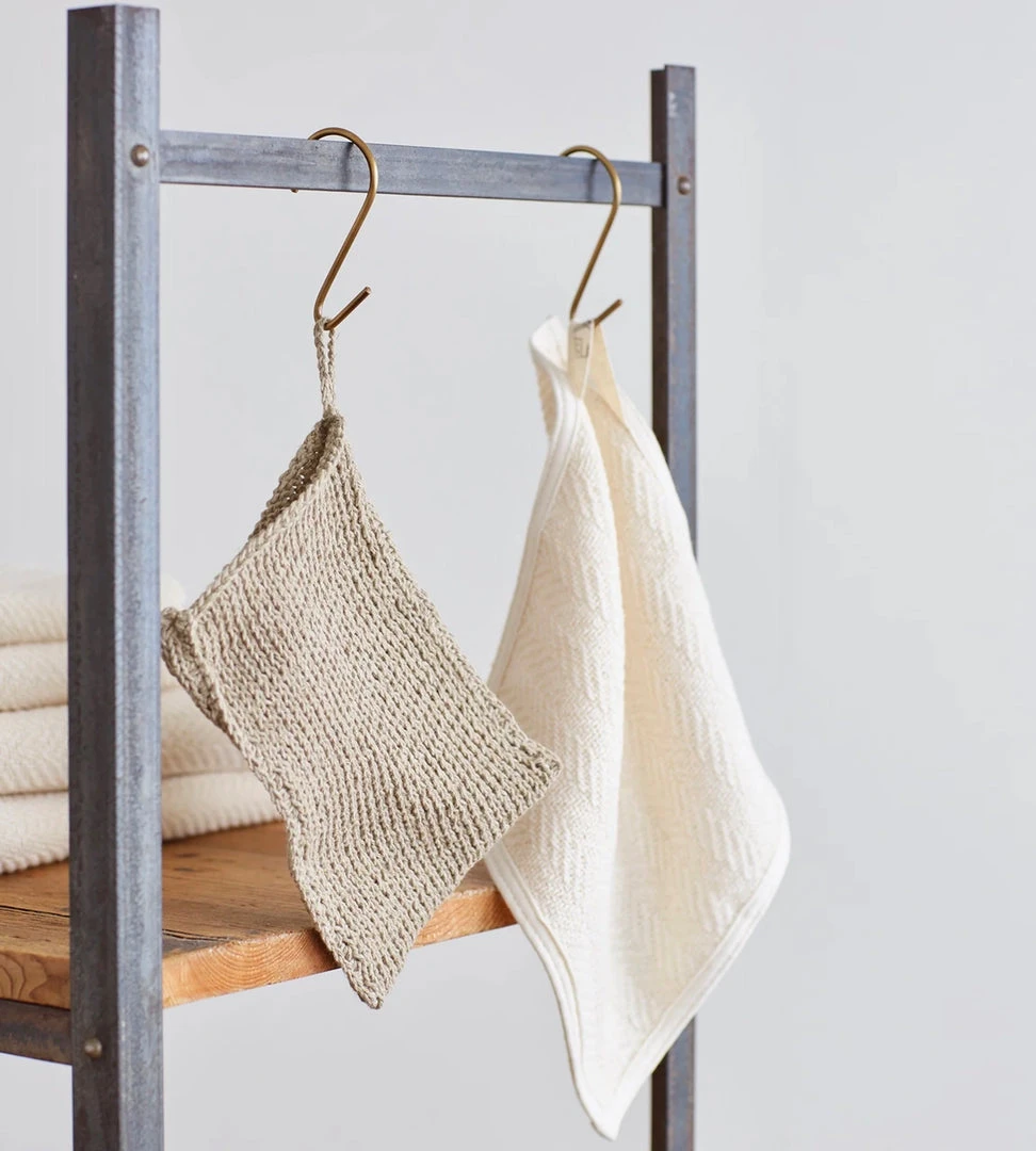 Hand-knit linen wash cloth for gentle exfoliation. Did you know that linen has natural anti-bacterial properties? It’s true. Loop for easy hang dry.