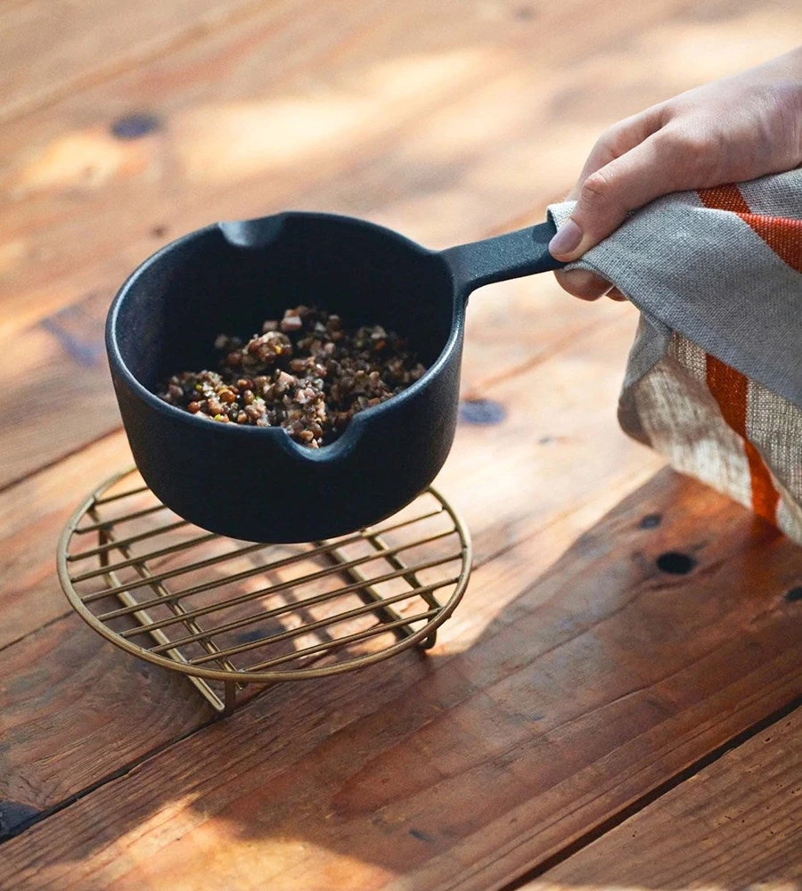 Fog Linen’s round brass wire rack is perfect for small batch baking or as a trivet on your counter or table. This round rack is great for cooling mini cakes or smaller baking dishes. As each is hand-made from brass in India, surfaces may not be uniform. This item will patina with use. To clean this item, only wash it by hand and dry it thoroughly.