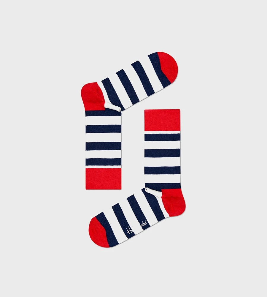Add a splash of red, white and blue to your sock drawer with this gift box set from Happy Socks. Filled with four pairs of our fun patterned socks, this matching box is covered in red, white and blue stripes for a simple yet luxurious gift. The combed cotton socks feature Polka Dot, Stripe, Filled Optic and Half Stripe for a unique and colorful combination.Â