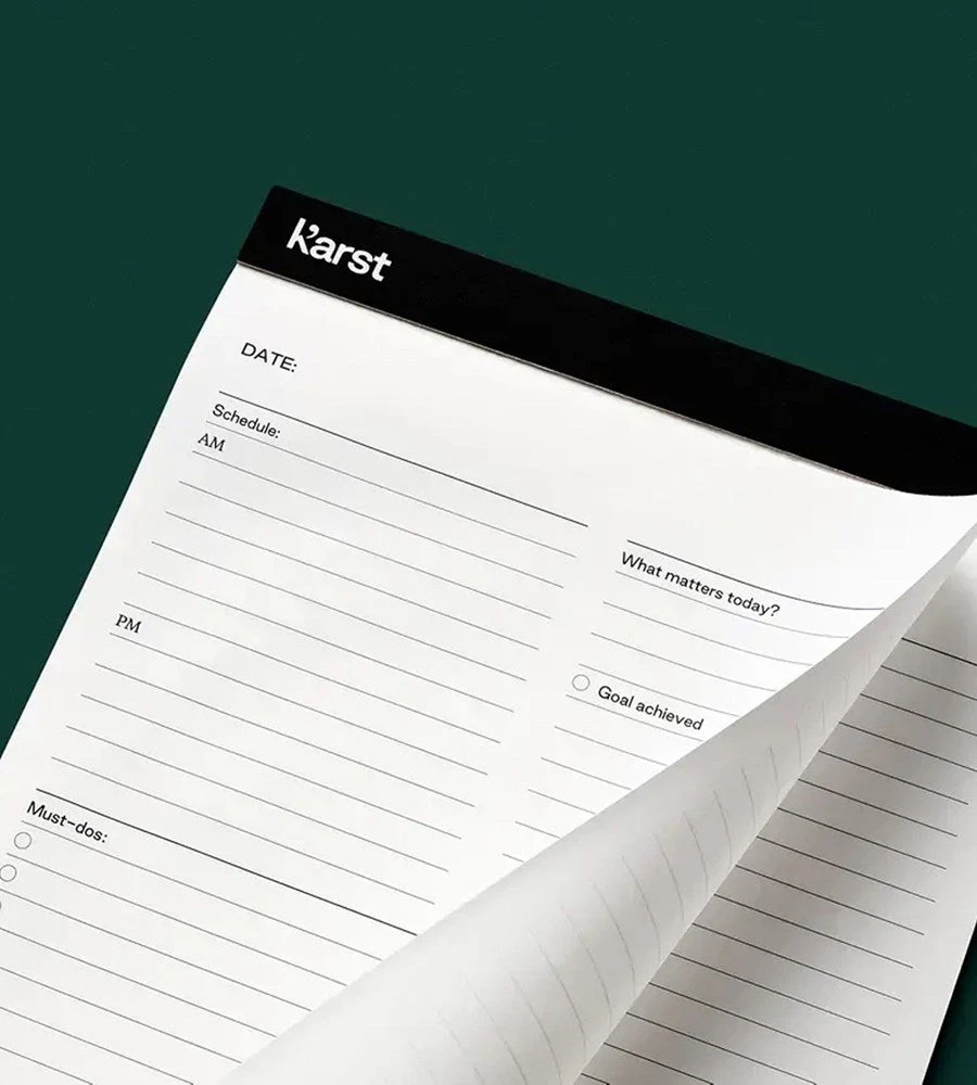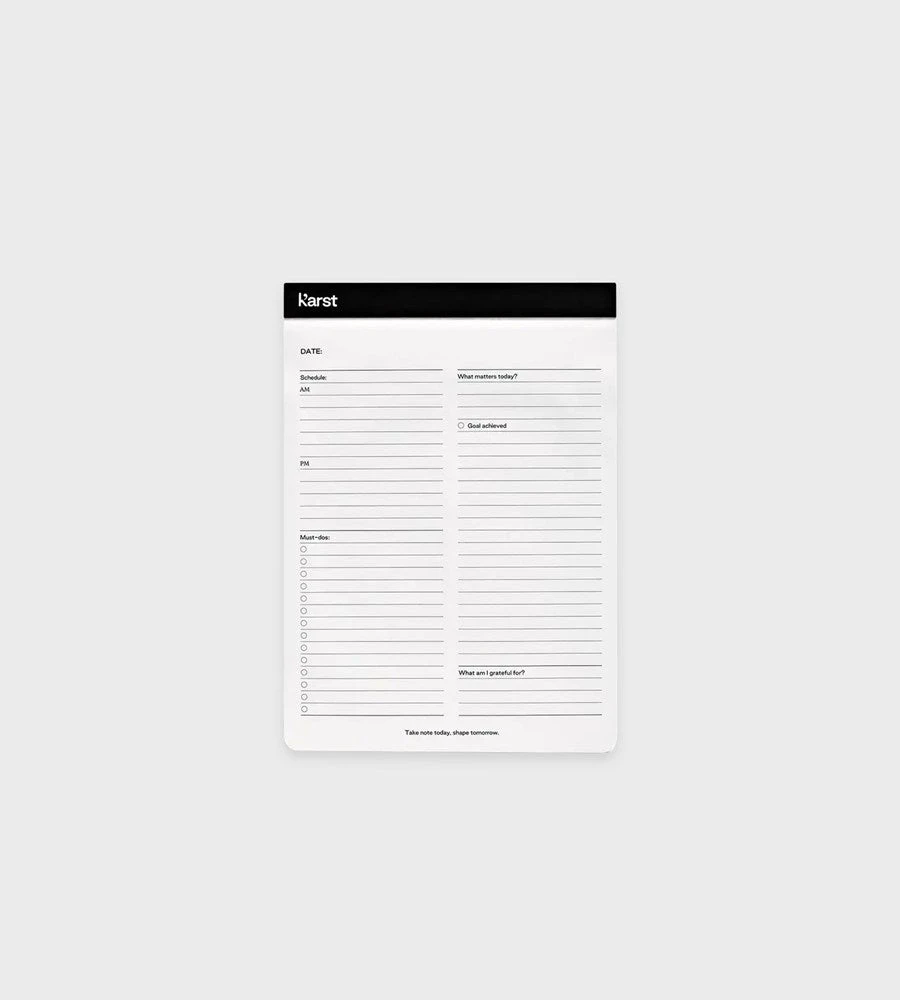 Karst’s Daily Action Pad is designed to stay by your side and help you achieve razor focus every single day. There’s working hard, and there’s working efficiently, consistently, reflectively. With a top flip binding, write comfortably from any angle, and remove each sheet with ease along the micro- perforation for that new notebook feeling every single day.