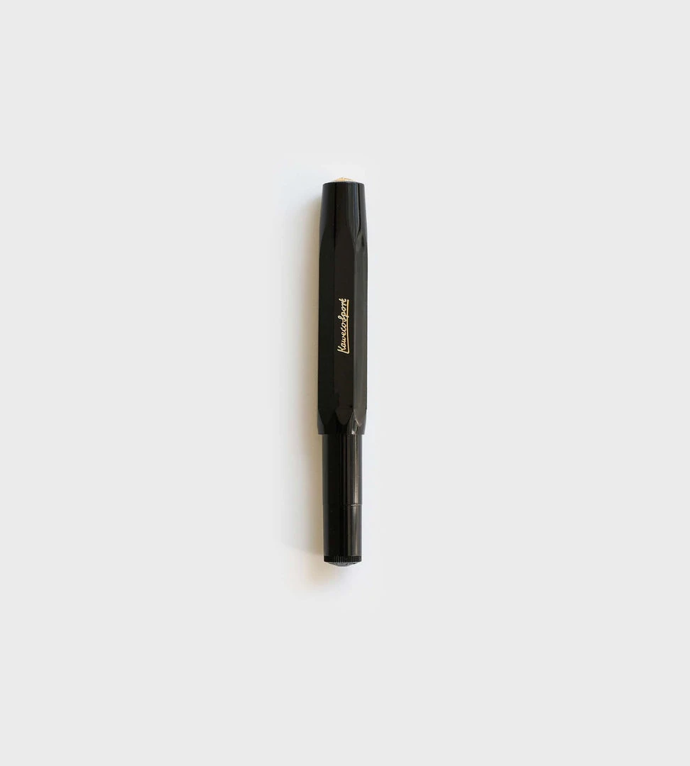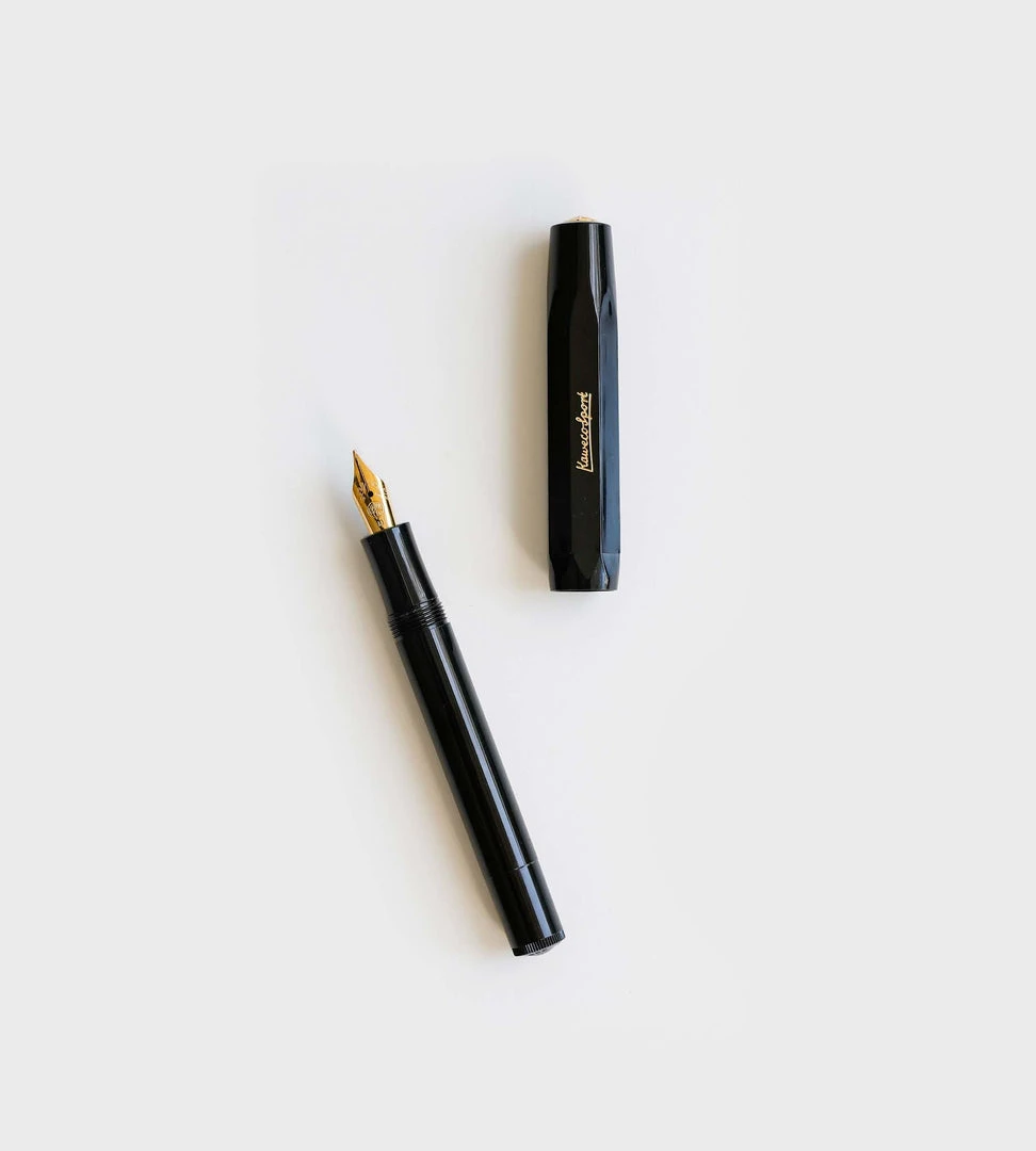 First designed in the 1930s, the German-made Kaweco Classic is a compact, reliable pen with an excellent vintage-meets-contemporary look. The pen is very compact – 10.5cm when capped and 13.3cm with the cap removed and posted on the end of the barrel for writing. The Classic has a screw cap and a gold-plated steel nib with an iridium tip.