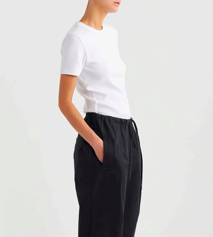 A new tee shape from Jac + Jack that is sure to become a wardrobe essential. This ribbed cap sleeve tee is a true wear-with-anything style, it’s cut from ribbed stretch jersey for a close fit. Juxtapose the aesthetic by styling it with relaxed slouchy pieces such as full pants or soft skirts.