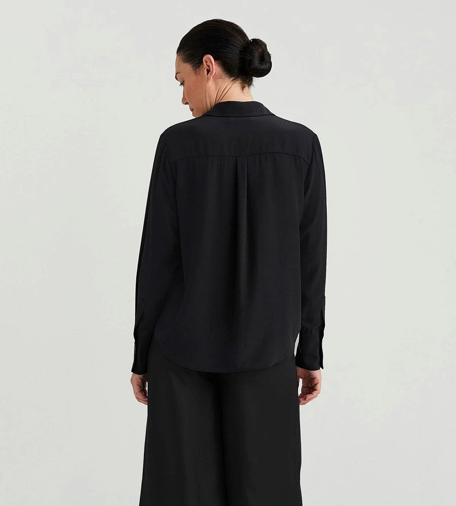 Fluid and elegant. This fine silk shirt by Jac + Jack is the perfect combination of modern with a timeless appeal. Cut from a soft 100% Silk Crepe De Chine, this piece has a romantic drape and features a sharp statement collar and oversized cuffs. Wear unbuttoned to show a little skin and tie back with matching silk trousers for a relaxed yet refined appeal. This piece fits true to size, it is recommended that you take your usual size. To clean this item, cold hand wash or dry clean.