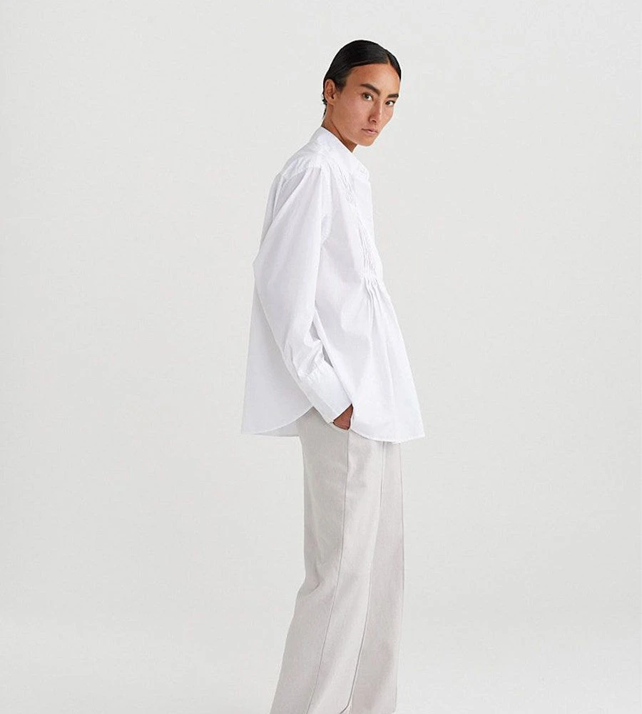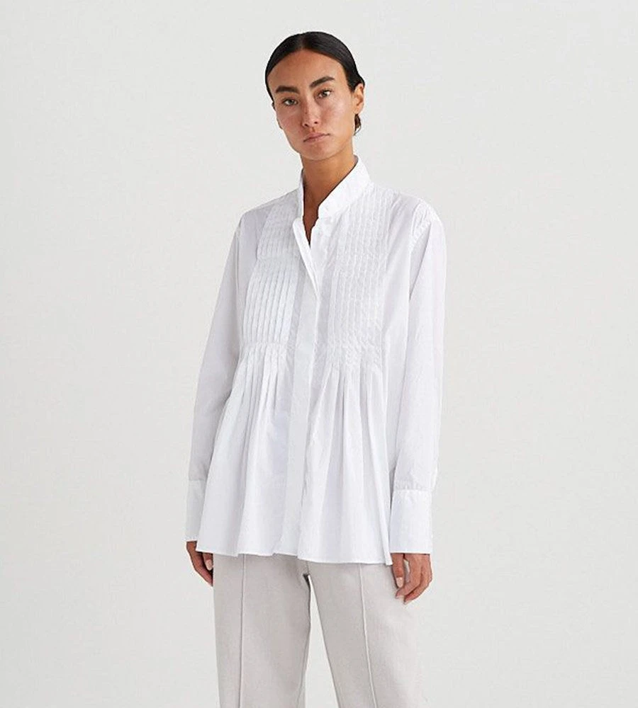 Jac + Jack’s Salt Shirt is a fresh take on the classic white button down. Featuring beautiful pleated detailing at the chest, and crafted from 100% cotton Italian shirting.
