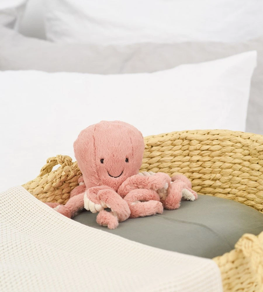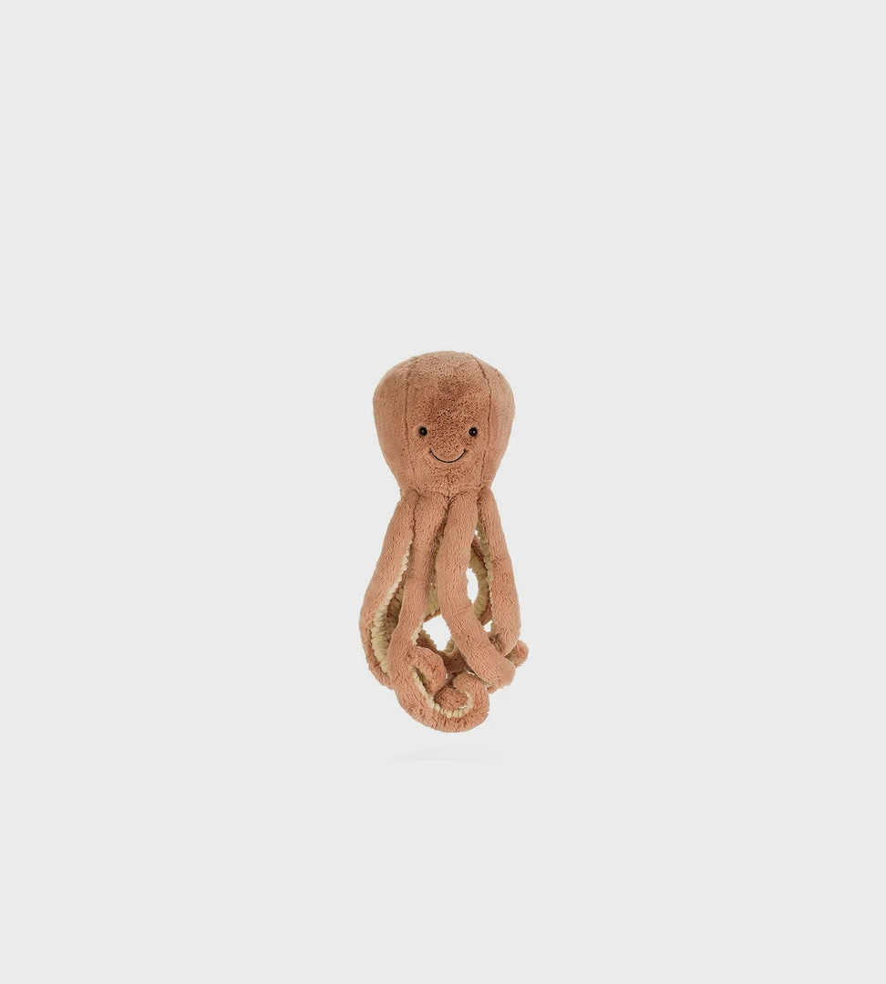 Get tangled up with gorgeous Odell Octopus! A squishy, splendid brick-red octopus, that has so much love to give! Smiley and silly, with bright, glossy eyes, Odell is one very friendly cephalopod. Odell has eight fine, curly arms with cosy cordy and classic fur. No surprise that Odell gives the best hugs in the ocean!