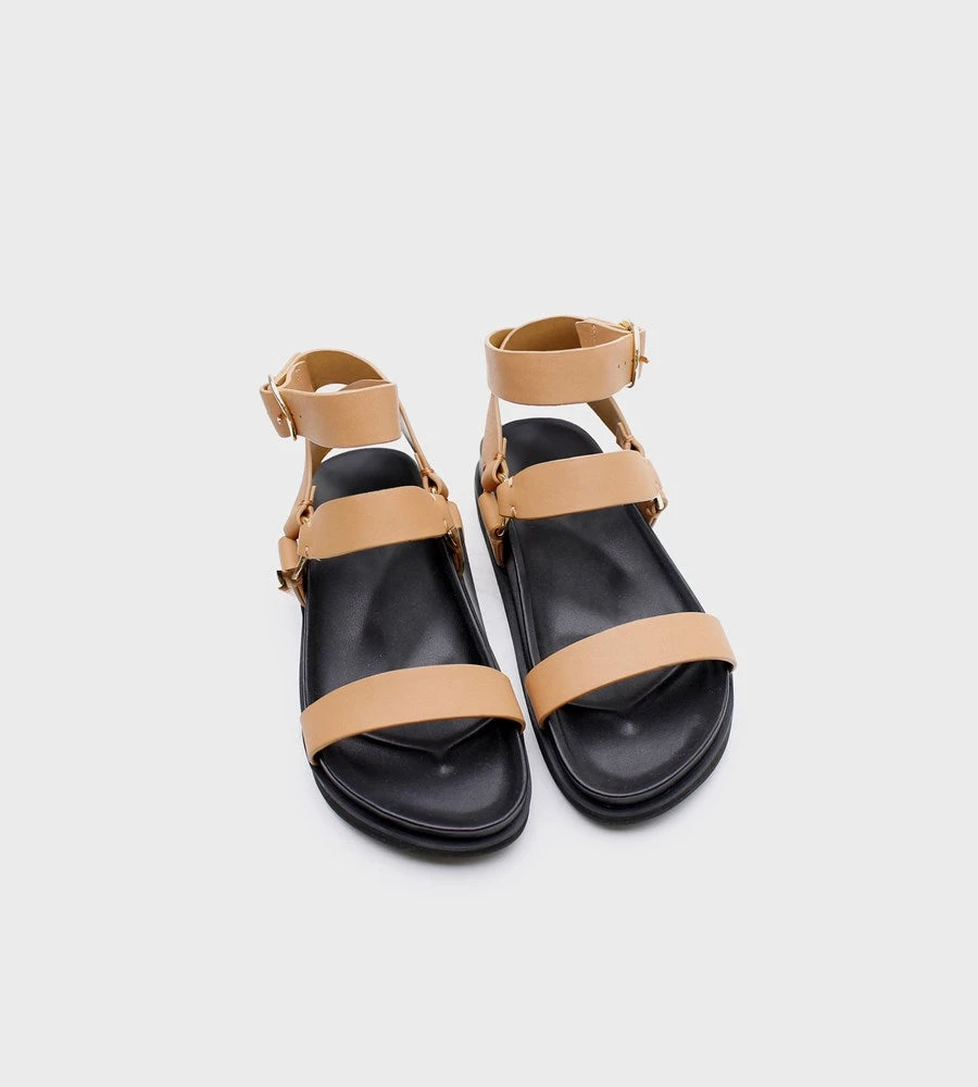 Meet your new favourite sandal! La Tribe’s platform sandal is sleek and minimal so you can effortlessly pair it with any outfit whether you’re going for a casual or dressy look. We love how this looks paired with a summer dress. Features a moulded footbed for maximum comfort while the waxed edge leather straps wrap the ankle adding a modern twist on the traditional gladiator.Â