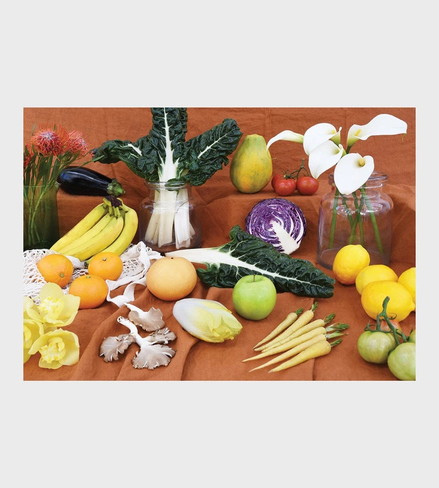 What a fantastic mix of fruit, veges, flowers and even mushrooms! This still life is set against a brick red textured linen. All the colours and textures will make this a joy to puzzle. Eat your greens!