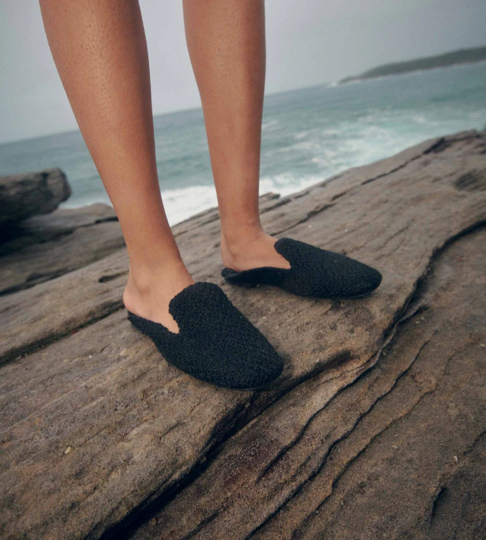 Mara & Mine’s Teddy Mules have a simple silhouette with a square toe crafted from textured boucle material and soft nappa leather. Wear them with neutral knitwear for a cosy-chic look.