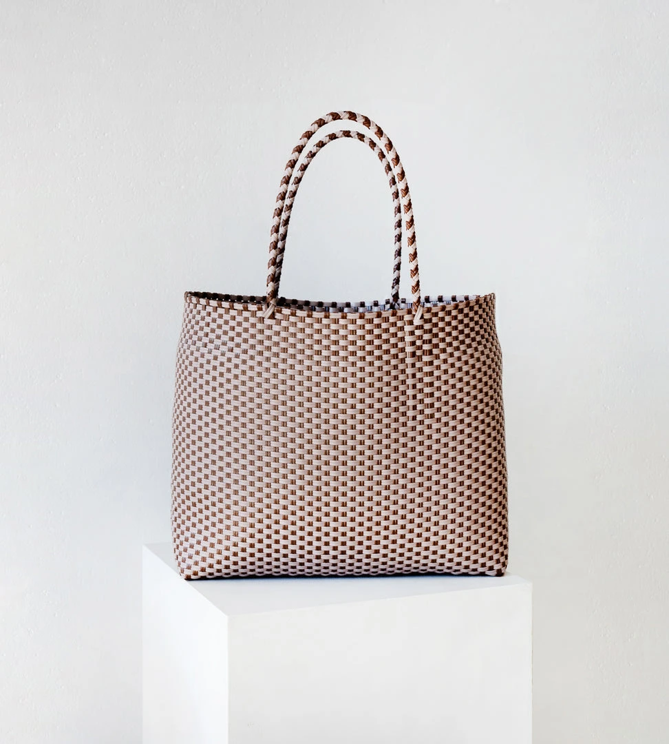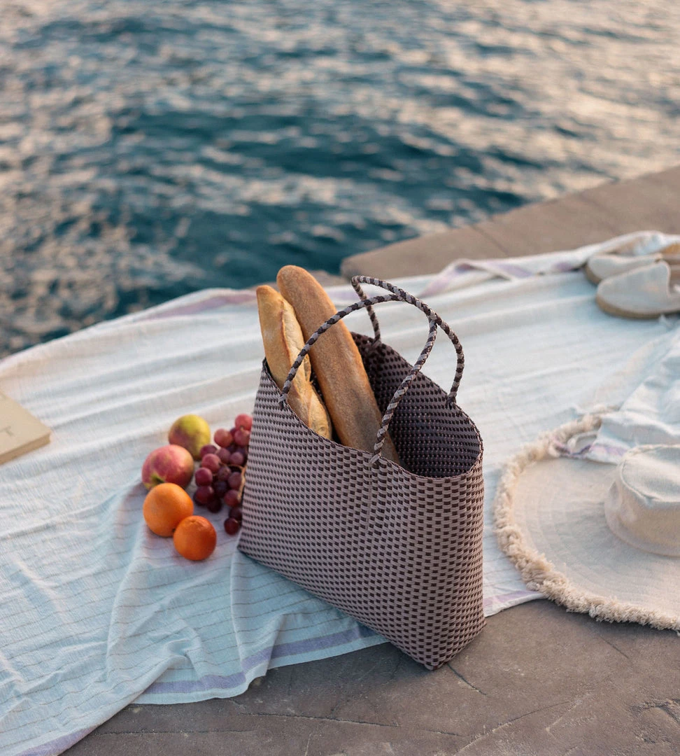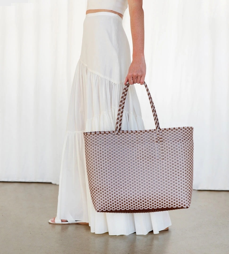 Mimmi Terra’s Eco Utility is an oversized slim tote, woven with mix shades and features a solid block colour bottom. The Utility tote is designed for all purposes, one to get you from work to weekend.