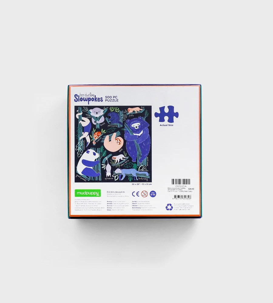 Tree-dwelling Slowpokes 500 Piece Family Puzzle from Mudpuppy features 11 beautifully illustrated slow-moving animals including a sloth, slow loris, and a giant panda. Mudpuppy puzzles are packaged in matte-finish sturdy boxes, perfect for gifting, reuse, and storage.