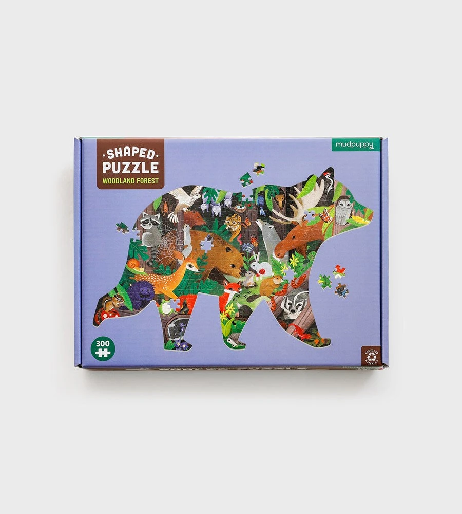 Woodland Forest 300 Piece Shaped Scene Puzzle from Mudpuppy features a colorful illustration of woodland forest animals. The puzzle is in the shape of a bear, adding a wow-factor when completed!