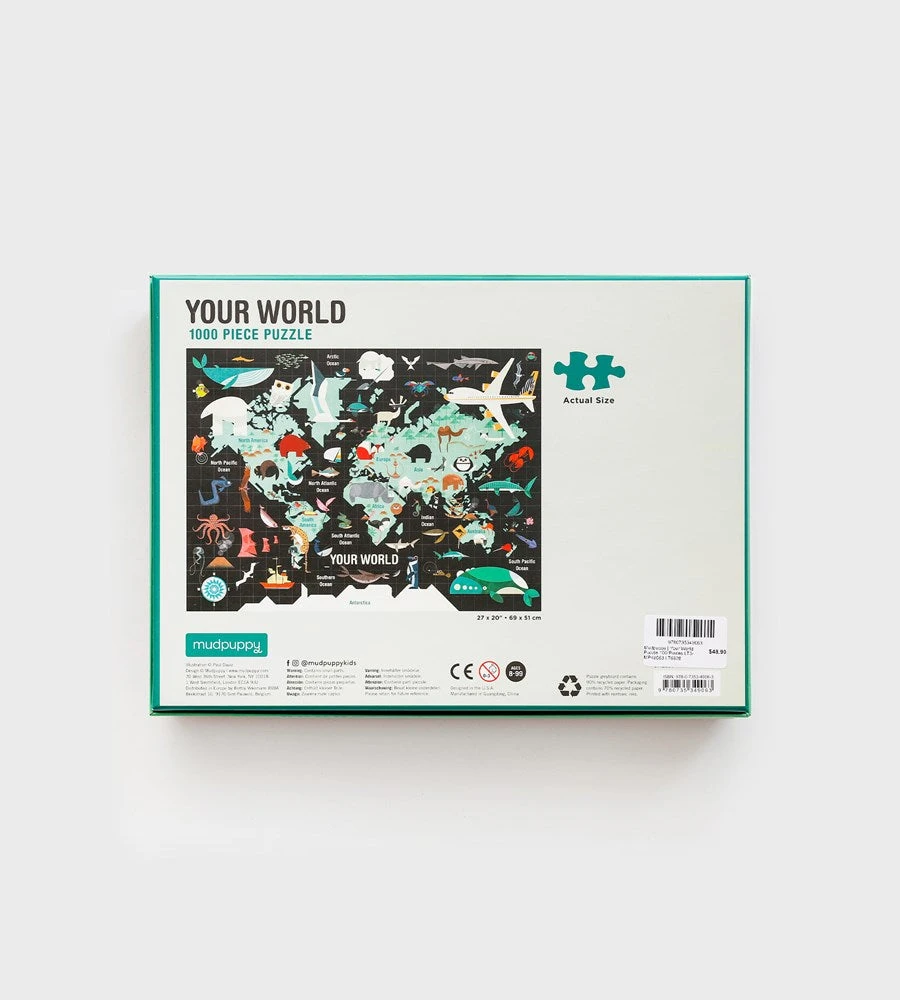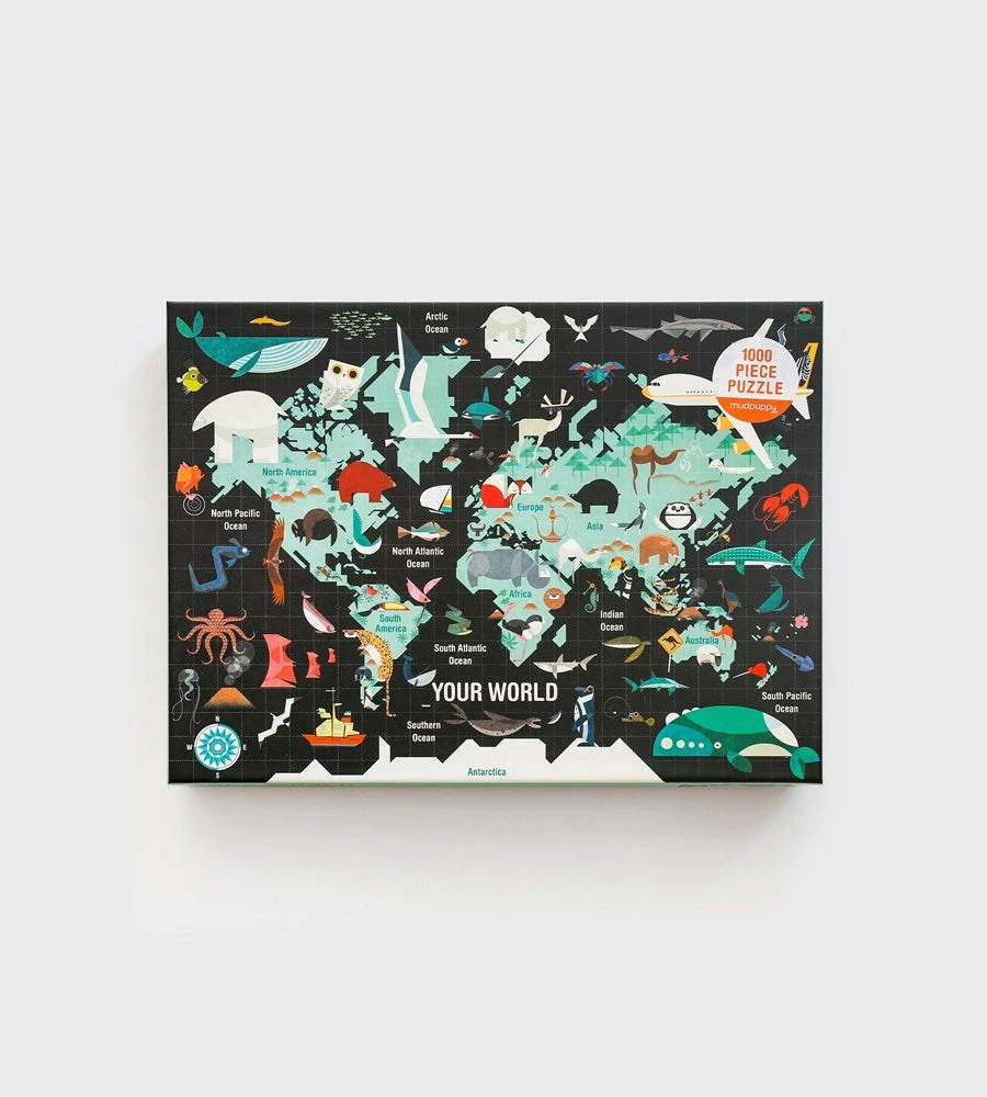 Put together this 1000 piece family puzzle from Mudpuppy to reveal: “Your World.” The completed puzzle features a vibrant and playful assortment of animals on a world map. The pieces come packaged in a sturdy box, perfect for gifting, reuse, and storage.