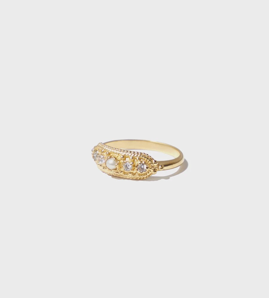 The Oriel ring by Mimi Et Toi is a 18K Gold plated ring that features a beautiful pearl & 4 zirconia stones. Mimi Et Toi jewellery is made to go with everything so that it can be worn with your everyday looks. Due to the neutral shape and tones the Oriel ring is easy to combine with all types of other jewelry and outfits.