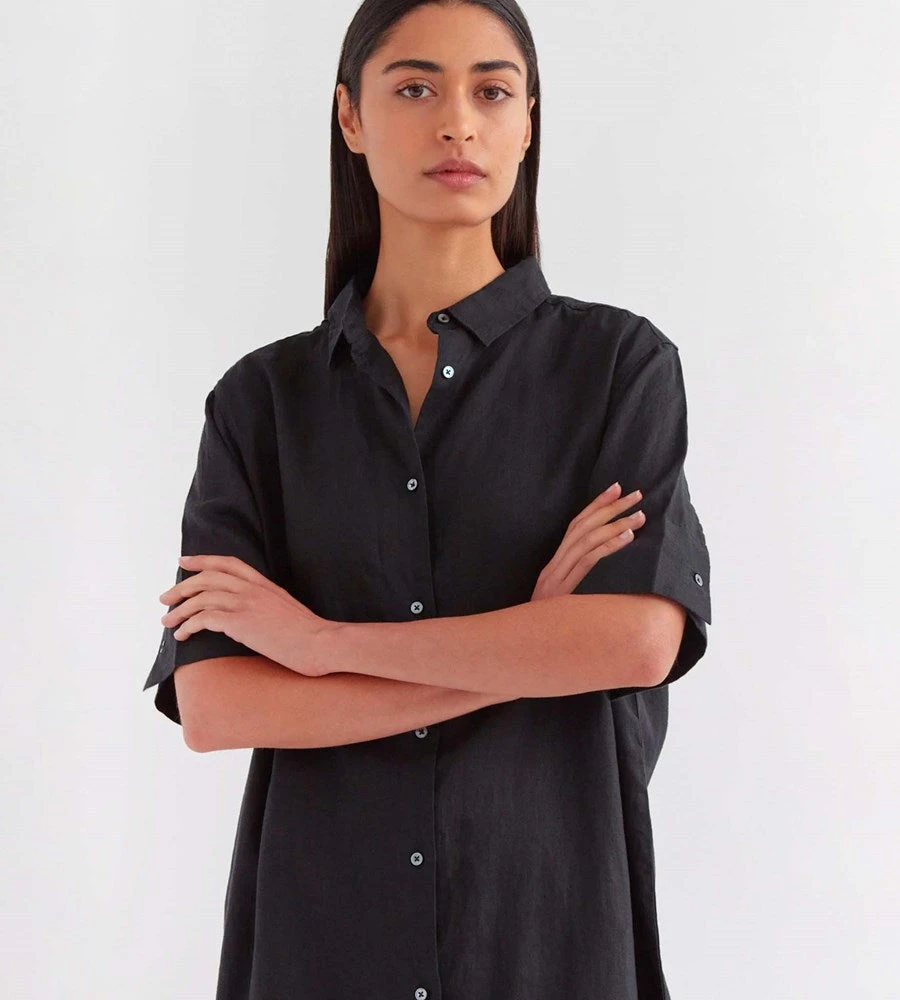 Assembly Label’s Tori Linen Short Sleeve Shirt Dress is a versatile piece with an oversized fit through the body and short sleeves. Made from 100% linen, you are sure to be comfortable in this piece. The model is wearing a size 8 and is 177cm tall with a 61cm waist. To get a similar oversized fit, take your usual size. Made in China.