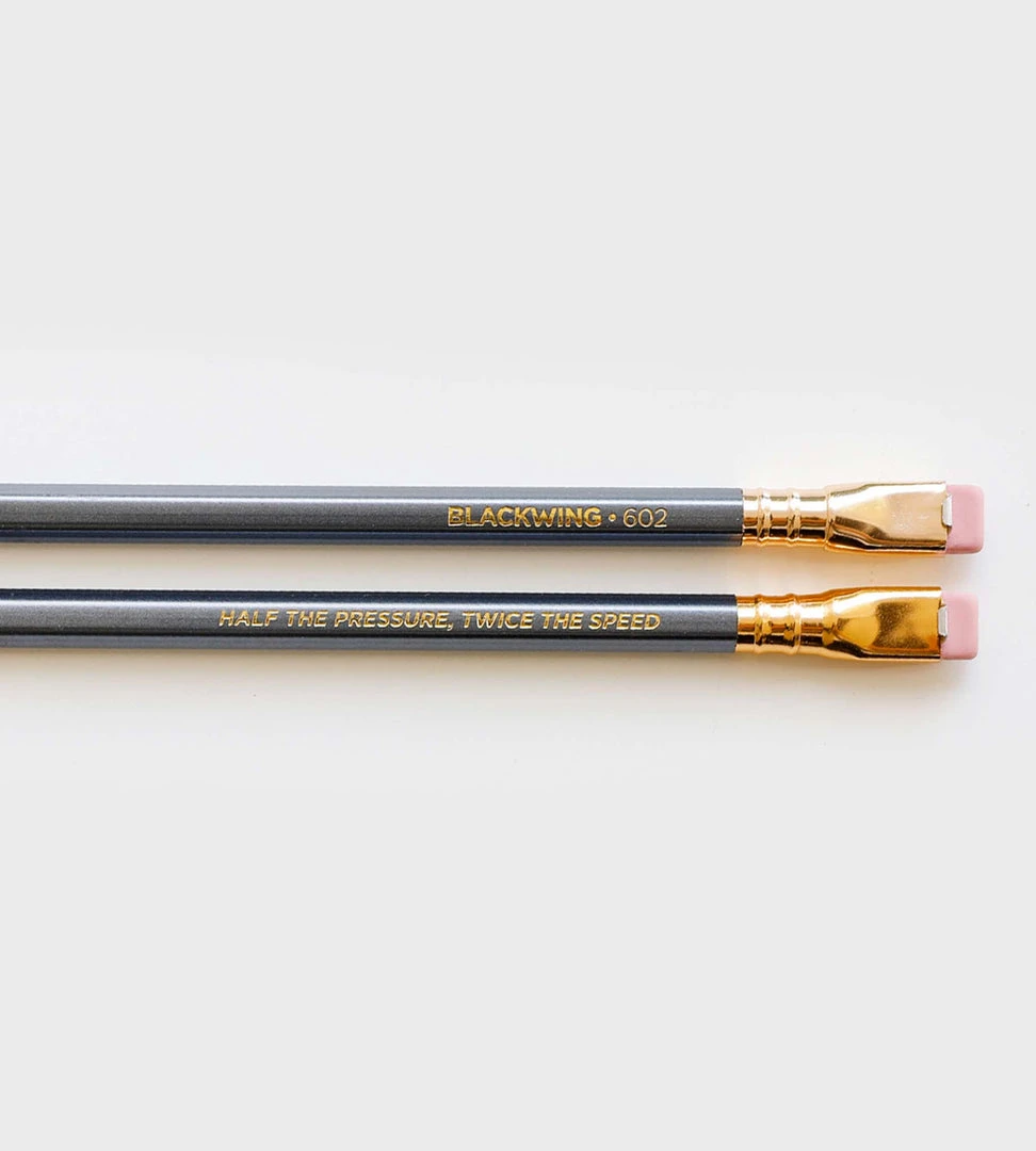 The iconic Blackwing 602 was the pencil of choice for John Steinbeck, Chuck Jones, and countless others before it was discontinued. In 2011, they brought it back. The Blackwing 602 features a firm and smooth graphite core that helps it deliver on its promise of “Half the Pressure, Twice the Speed,” a gunmetal grey finish and iconic square Blackwing ferrule with a pink eraser.
