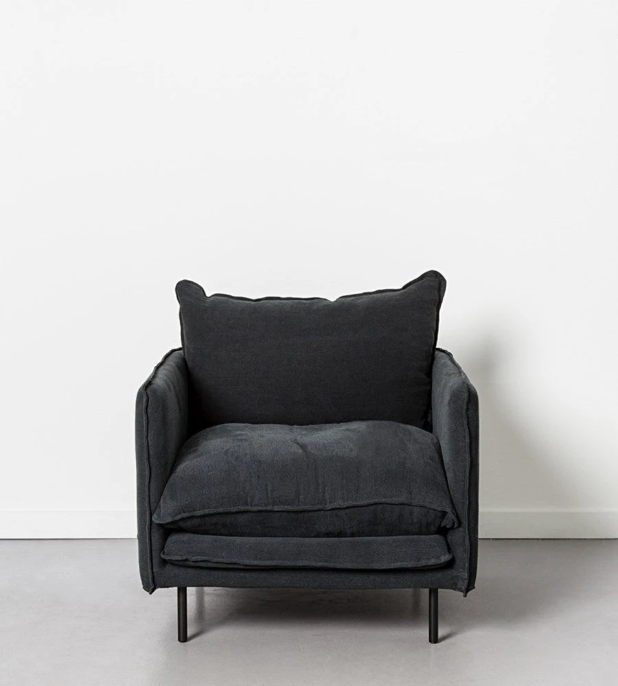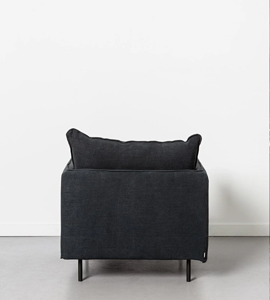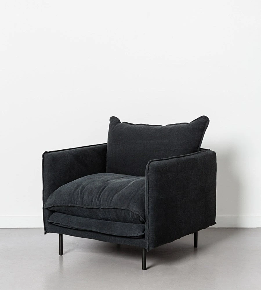 This armchair has super-generous proportions, slender arms and elegant cylindrical black metal legs. Practical, simple, clean. Japanese designed and made from a 100% linen. With a single back cushion, the super-soft and silicon-fibre filling means it is great for those with feather allergies.