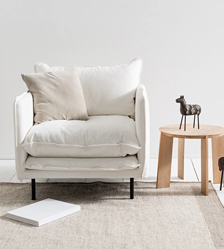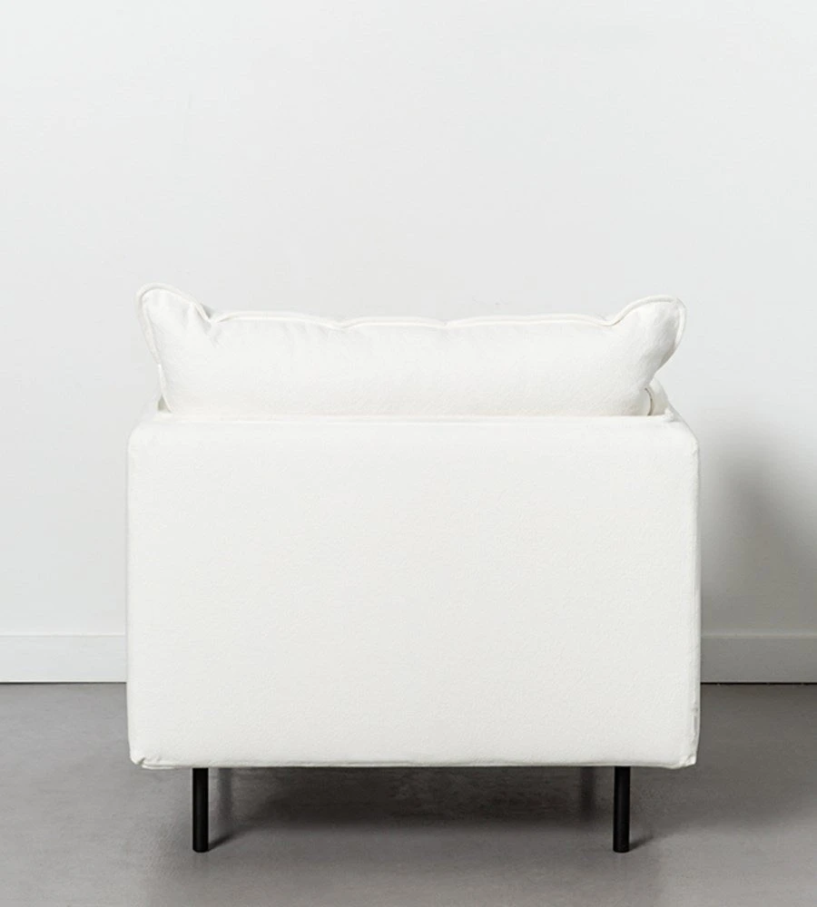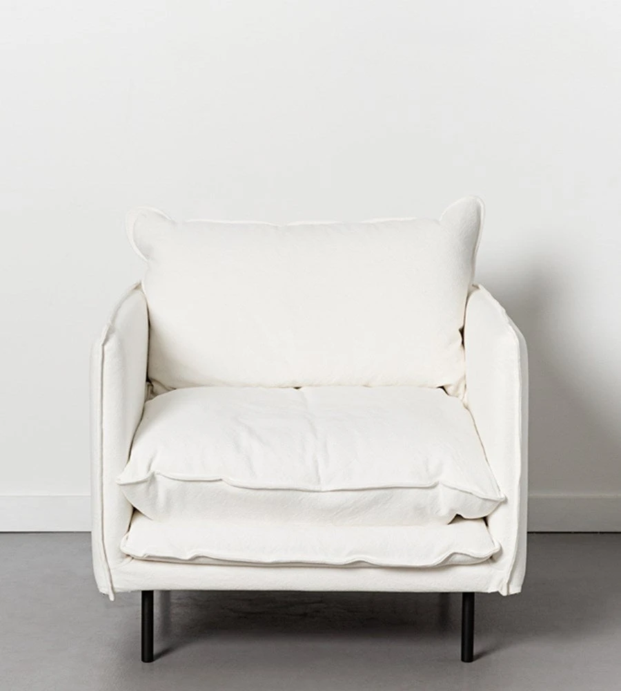 This armchair has super-generous proportions, slender arms and elegant cylindrical black metal legs. Practical, simple, clean. Japanese designed and made from 100% cotton. With a single back cushion, the super-soft and silicon-fibre filling means it is great for those with feather allergies.