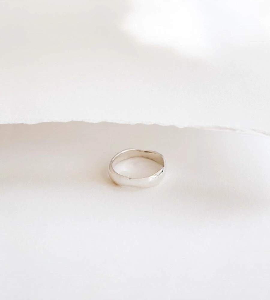 Undulating waves of metal, both fluid yet solid. Pigment Studio’s Ebb ring can be worn alone as a statement piece, or layered with finer rings to create a stacked look.