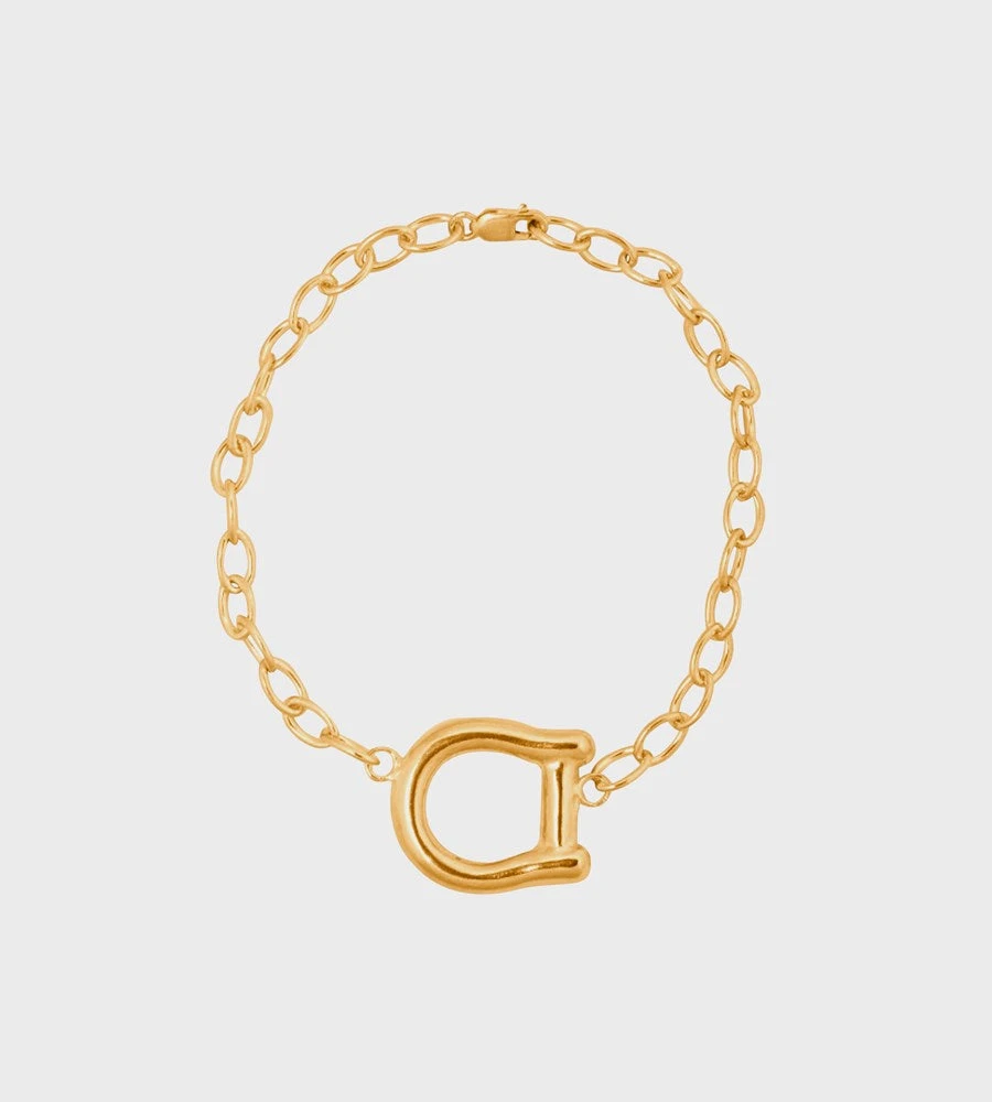 Released From Love’s Horseshoe Bracelet blurs the line between everyday wear and statement. This piece stands against horse-racing. In jewellery, the use of a horseshoe means luck. In this jewellery it means anti-cruelty. Ethically handcrafted in Australia from 24kt gold vermeil, the Horseshoe Bracelet details Released From Love’s signature use of aesthetic contradiction – perfect meets imperfect; abstract meets minimal; fine meets chunky.Â