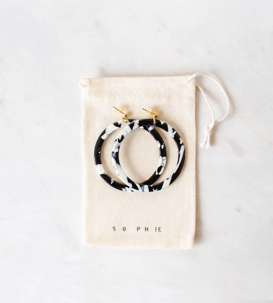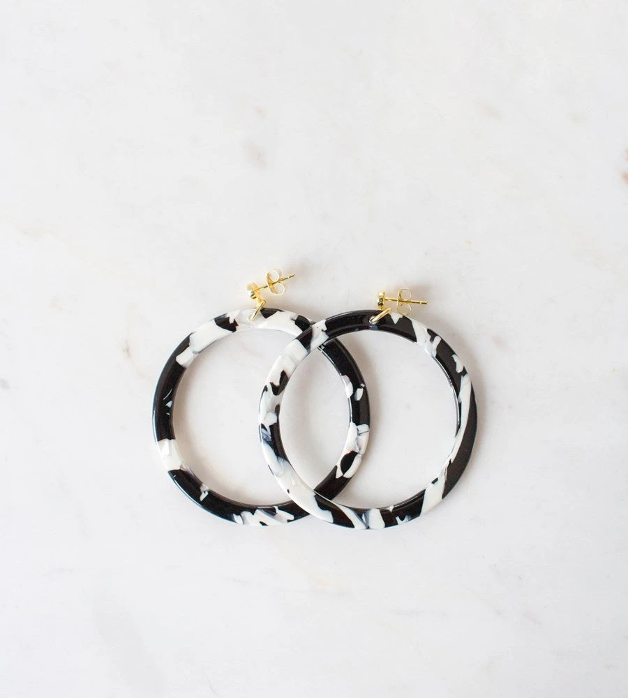 Sophie’s beloved hoops now come in monochrome! Beautiful black and white marble effect. Dress up or down.