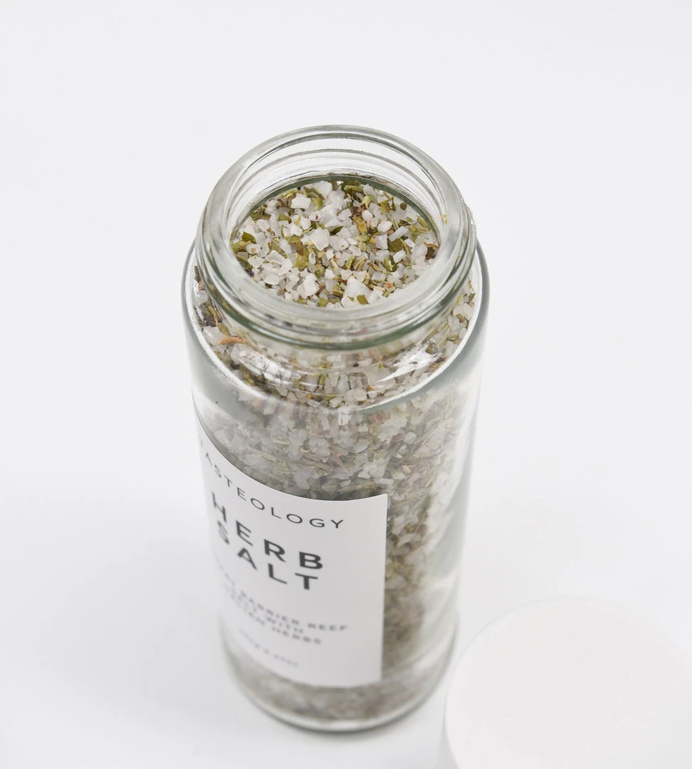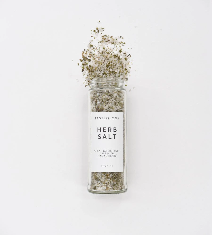 Tasteology’s herb salt has a base of Great Barrier Reef white rock salt, which has been carefully mixed in with dried oregano, marjoram, thyme, parsley and sage. This creates a very versatile herb salt to be enjoyed on a wide variety of foods. Sprinkle on your favourite pasta, rub into meat for a flavoursome roast, season your eggs or mix with olive oil to season your salad.