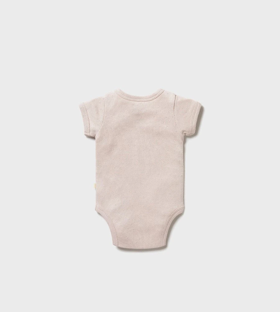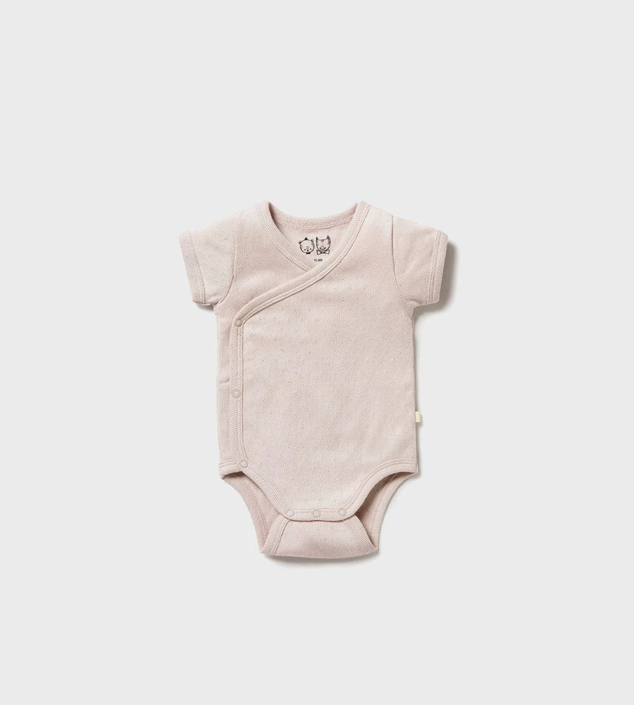 This short sleeve pointelle bodysuit features a kimono style closure and snap leg opening for quick and easy changes.Â