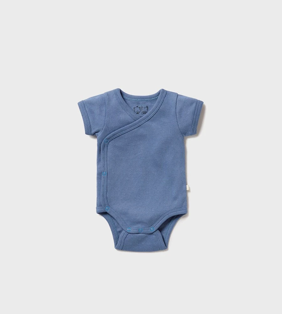 This short sleeve pointelle bodysuit features a kimono style closure and snap leg opening for quick and easy changes.