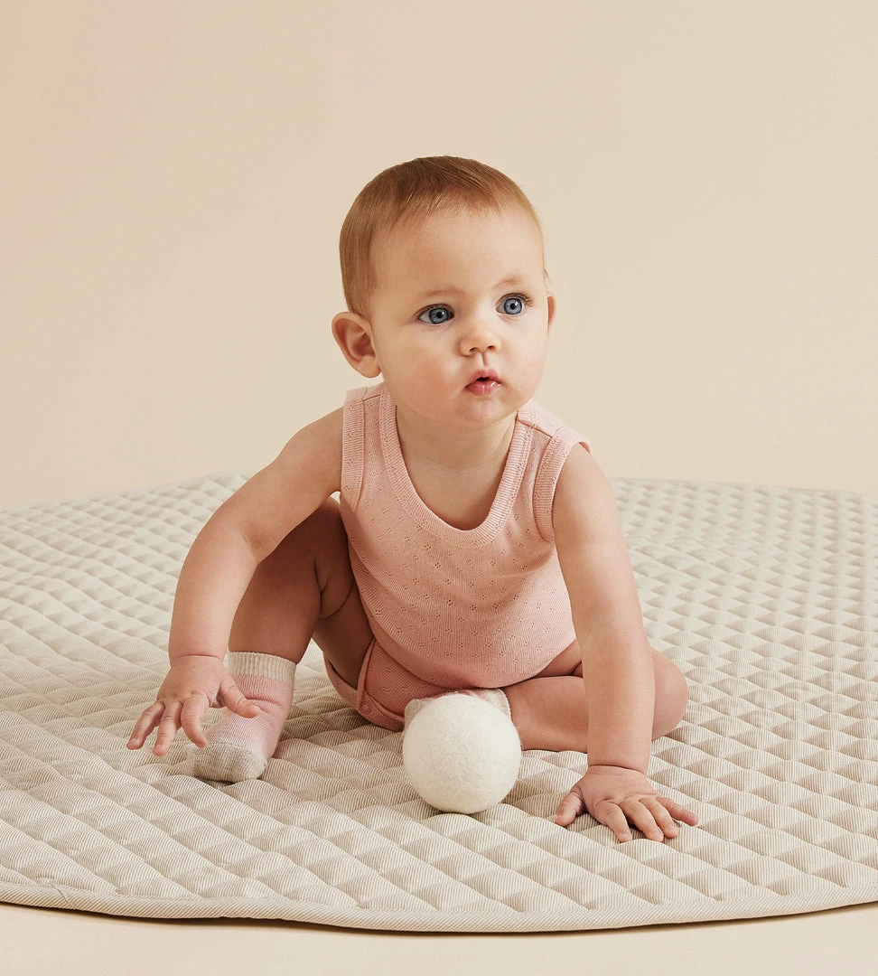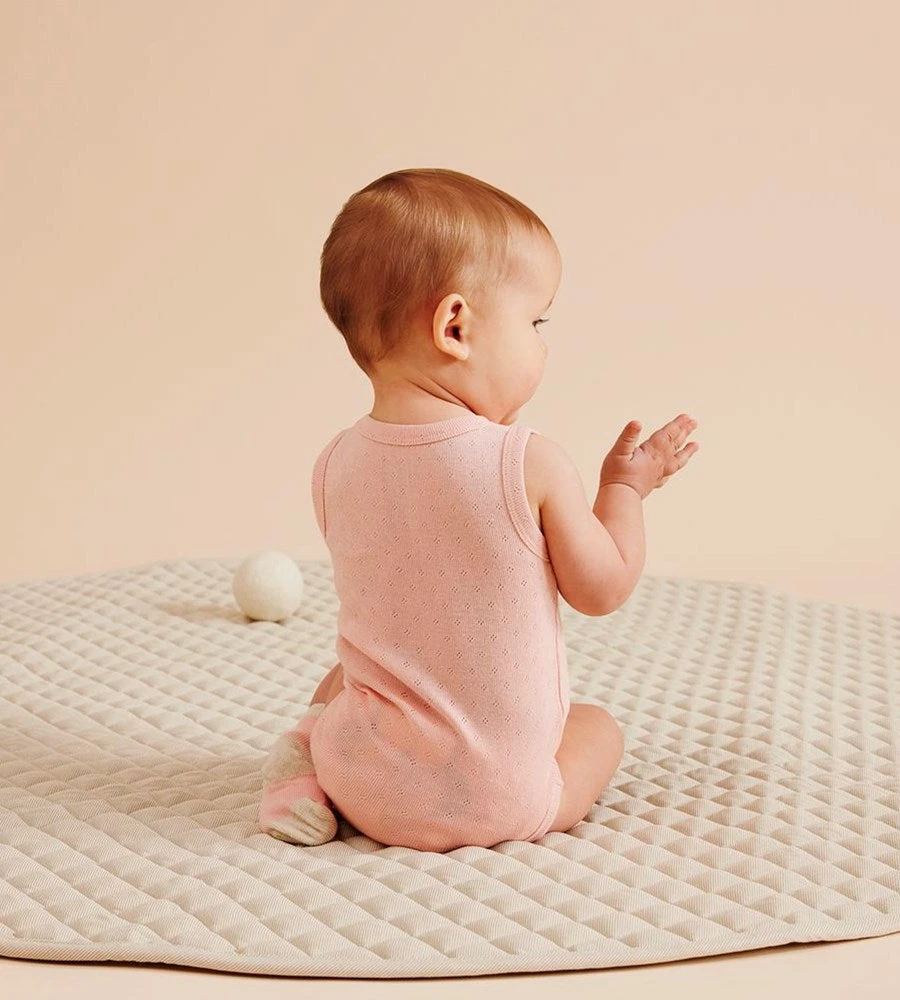 Made from 100% GOTS certified organic cotton, Wilson & Frenchy’s pointelle singlet bodysuit features a snap crotch opening for quick nappy changes.
