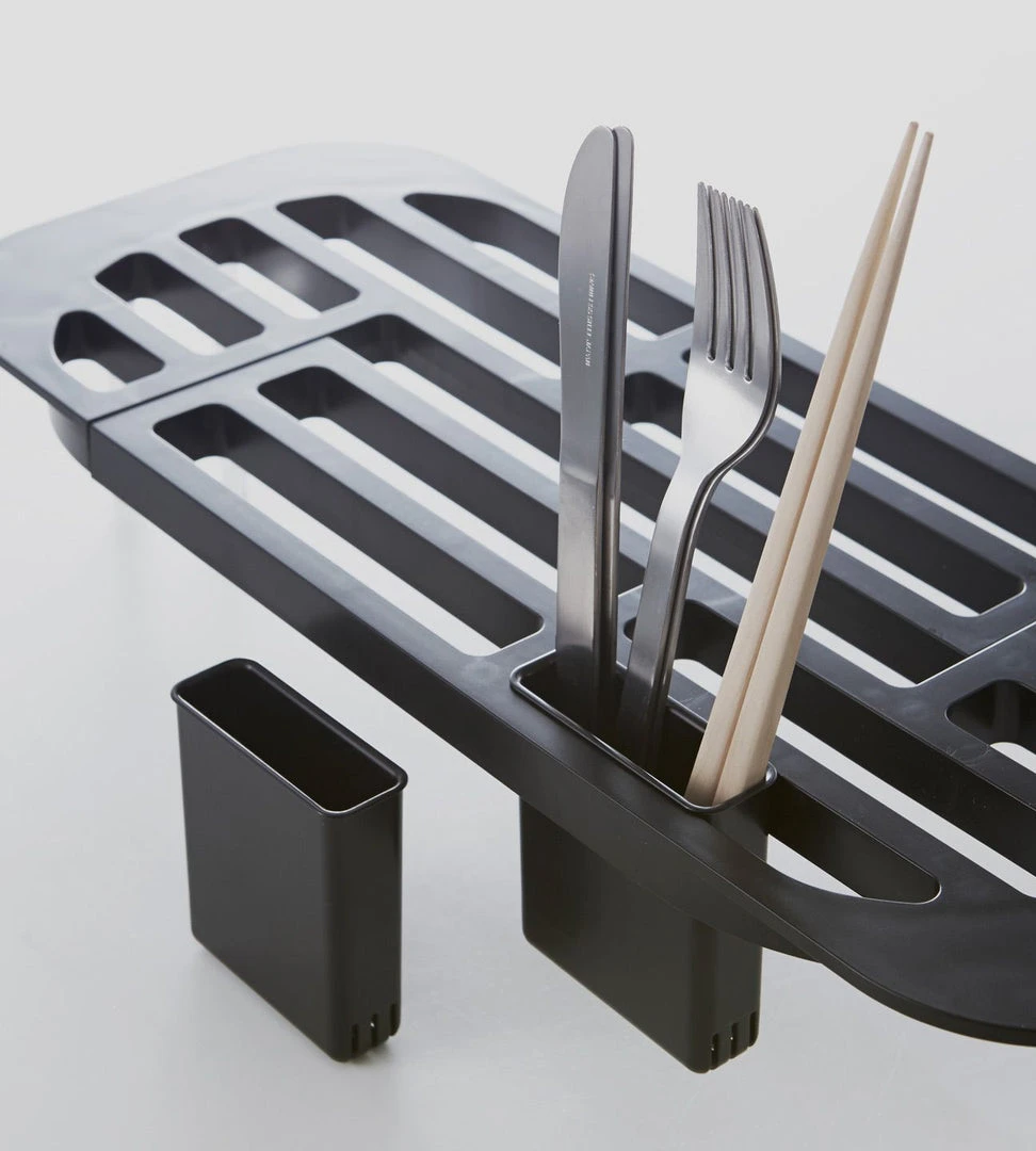 This sink drainer by Yamazaki is made from heavy duty plastic and expands or contracts to fit numerous sink sizes. It sits over the sink for dishes to drain and dry naturally. It also comes with two small removable compartments for utensils. Can also be used to drain vegetables and fruit after rinsing.